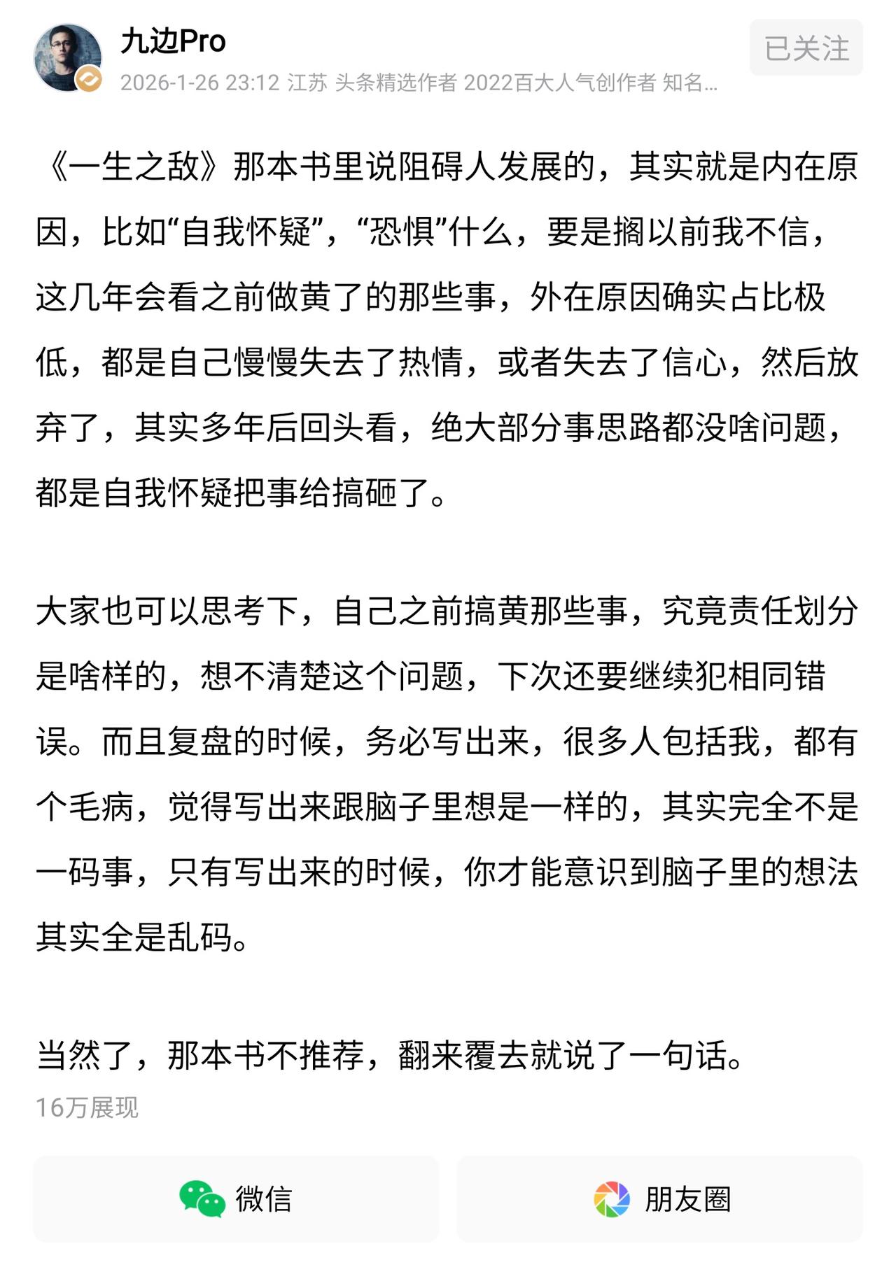 看了这段话,可以给你省24.9块钱。 之前一直不理解为什么说自己是自己最大的敌人,看到@九边Pro 老师写的这篇微头条才忽然有所感悟。想想他说的这一段话真的非常有道理,有的时候事到临头忽然心理害怕就要退缩,其实真的克服自己的心理障碍,离成功也就差了一步之遥。 想起来刚结婚的时候要考一场对我职业非常重要的考试,每天回家埋头苦学,读至深夜。恰巧当时工作又特别忙,双重压力下来整个人都不好了。相信大家都有一种体会,什么都不学的时候感觉自己啥都会,但是真正拿起书本学习的时候,却发现越学越不会。 所以当时马上临近考试时间了,就想放弃,对自己特别没有信心,感觉肯定考不过,甚至考试都不想参加了。最后还是在媳妇的鼓励下才考试了,当时想想就算考不过,也给这一段辛苦学习的自己一个交代。但是没想到最后居然考过了。 所以有的时候真的是这样,战胜一个胆怯、怀疑的自己,不要给自我设限,人生就有无限可能。当然之后按照九边提到的方法可以试一试,在没有做好的事情上复盘写下来,不要光停留在脑子中,兴许有意想不到的效果。 九边说的这些道理都是来源于一本畅销书叫《一生之敌》,我查了查当当网这本书现在的打折价格是24.9元,大家看了我的微头条或者九边的微头条就不需要再买来读了,实实在在为大家省钱了。