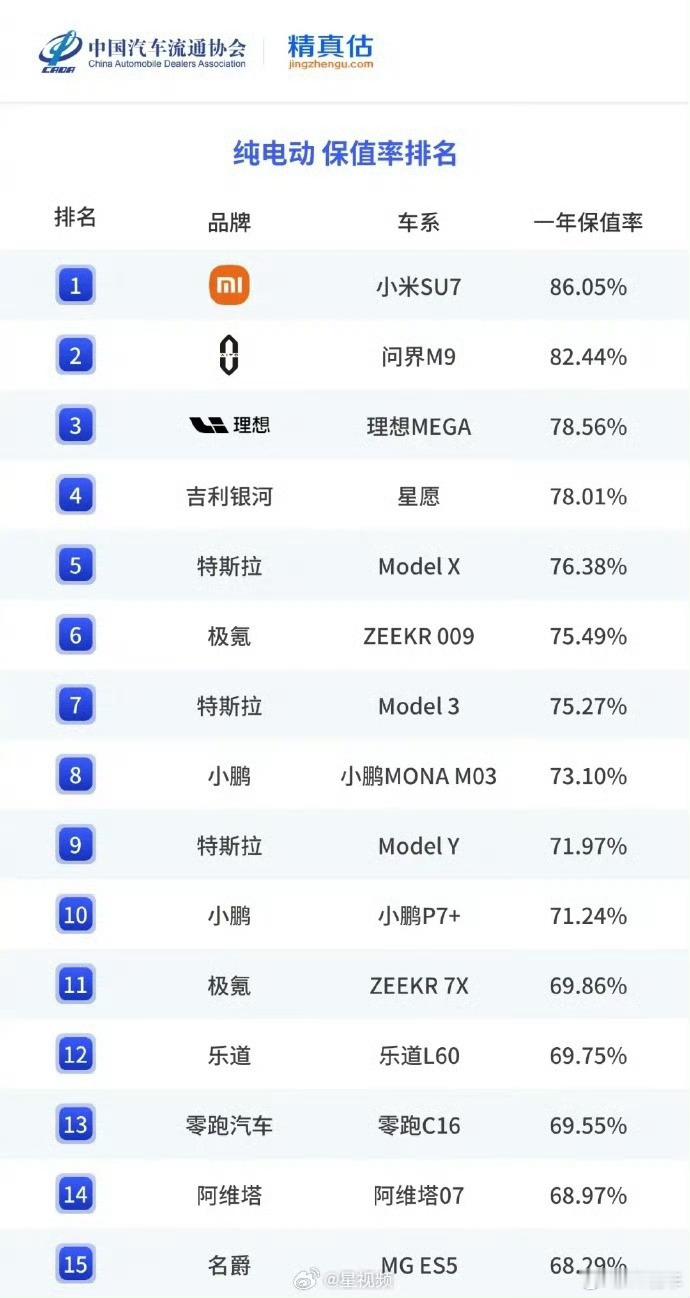 “中国汽车流通协会”给出的纯电动车一年保值率排名。小米su7以88.91%的一年