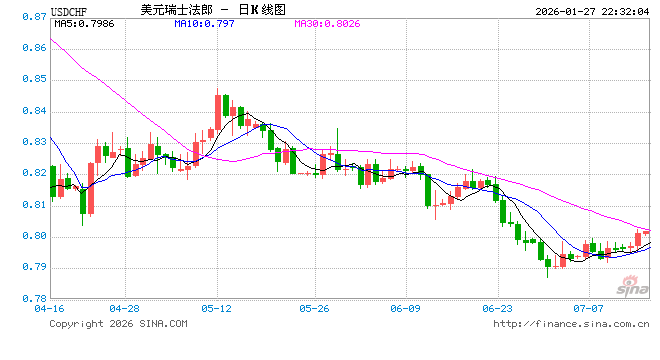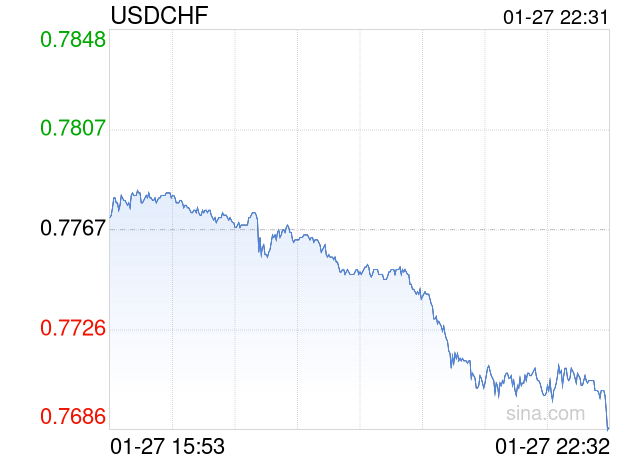 新浪外汇消息2026年01月27日,截至22时31分,外汇市场上美元兑瑞士法郎汇率跌破1美元兑换0.7687瑞士法郎。跌幅为-1.0300%
