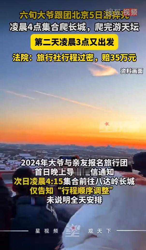 北京,一六旬大爷满怀期待踏上五日游旅,第一天深夜,导游短信通知次日凌晨四点一刻集合登长城。大爷摸黑起床,在烈日下攀登后已显疲态。岂料下午返程大巴上,导游临时宣布“赠送”天坛游览。次日,更严峻的考验到来,凌晨三点一刻,睡眼惺忪的团队再次集合观看升旗。连续的高强度活动与严重不足的休息击垮了大爷。走向大巴车途中,大爷渐渐落后,突然捂着胸口瘫倒在地。虽经路人急救并送医,仍因呼吸心跳骤停不幸离世。事后,家属痛诉旅行社安排失当,而旅行社则以老人未告知高血压病史为由推诿。法院这样判决。 据悉,2024年7月,年过六旬的江大爷,与几位老友一同报名参加了某旅游公司组织的“北京经典五日游”。 江大爷身子骨还算硬朗,平日里喜欢散步、下棋,只是有多年高血压的老毛病,一直靠药物控制,倒也相安无事。 这次去北京,是他心心念念已久的愿望,去看一看天安门,爬一次长城。 旅行团共二十余人,多半是中老年人。 出发前,江大爷的儿女再三叮嘱:“爸,行程要是太累,您就歇着,别硬撑。” 他笑着摆摆手:“放心,我跟团走,有导游安排,累不着!” 行程第一天傍晚,刚入住酒店不久,包括江大爷在内的所有团员都收到了一条来自导游陈导的短信,提及明日行程顺序调整,集合时间提前至凌晨4点15分。 江大爷虽觉有些突然,但想着“客随主便”,还是定了闹钟早早休息。 第二天,凌晨三点多,老人们便挣扎着起床。四点多,大巴车在朦胧夜色中驶向郊区。 近两小时车程后,抵达八达岭长城脚下时,天色刚亮。陈导在车上宣布:“今天咱们先爬长城,上午精力好!原定的奥林匹克公园下午去。” 江大爷爬了不到三分之一,便气喘吁吁,脸色发红。 同行的老友劝他:“老江,歇会儿吧,别上去了。” 他擦了把汗,看着不远处飘扬的烽火台,不甘心:“来都来了,再坚持一下。” 最终,他勉强登上了第一个高点,但体力消耗巨大。 下午参观奥林匹克公园时,江大爷已显疲态。 然而,在返回市区的车上,陈导又通知新增了两个项目,‘老北京传奇’剧场演出和天坛公园的游览。 江大爷和朋友们商量了一下,觉得“天坛是课本里的地方,该去看看”,便都同意了增加天坛的行程。 等团队最终返回酒店,已是晚上七点多。 江大爷匆匆吃过饭,倒头便睡。 凌晨2点45分,刺耳的闹钟再次响起,因为这天安排了观看升旗仪式,江大爷几乎没怎么睡醒,头脑昏沉地洗漱集合。 观看完庄严的升旗仪式,团队在广场附近简单用了早餐。 随后,按计划应前往故宫游览,走着走着,江大爷的步伐越来越慢,渐渐落在了队伍最后。 突然,他身体晃了晃,捂住胸口,对身旁的老友说了句“我不太舒服……”,便缓缓瘫倒在路边。 经过路人及急救人员的抢救,江大爷不幸离世。 料理完后事,家属认为,江大爷虽然患有高血压,但平时控制良好,若非旅行社的行程安排严重不合理,悲剧完全可以避免。 于是,家属一纸诉状,将旅游公司告上法庭,提出了包括死亡赔偿金、丧葬费、精神损害抚慰金等在内巨额赔偿。 面对指控,旅游公司辩称江大爷的直接死因是高血压引发的呼吸心跳骤停,属于自身疾病所致。旅行社的安排并非直接致死原因。 关键是,江大爷在报名时及行程中,从未向旅行社告知其患有高血压病史,导致旅行社无法对其给予特别关注。 法院会如何判决呢? 最高法《关于审理旅游纠纷案件适用法律若干问题的规定》第七条规定,旅游经营者、旅游辅助服务者未尽到安全保障义务,造成旅游者人身损害、财产损失,旅游者请求旅游经营者、旅游辅助服务者承担责任的,人民法院应予支持。 法院指出,旅行社对游客负有安全保障义务,尤其是对老人游客,更应该格外注意。 具体到本案,旅行社连续两日要求老年游客于凌晨三、四点集合,严重剥夺必要休息时间,形成高强度、快节奏的疲劳旅程,行程安排严重不合理。 在游客已显疲惫的当日下午,以“赠送”名义增加天坛行程,实质加重了游客身体负担,且未就此充分提示风险。 法院认为,旅行社作为专业机构,应当预见到此种安排对老年群体的特殊风险,但其未尽到审慎的注意与充分的警示义务,违反了法定的安全保障义务。 不过,《民法典》第一千一百七十三条规定,被侵权人对同一损害的发生或者扩大有过错的,可以减轻侵权人的责任。 法院进一步指出,江大爷自身亦有过错,其明知自身患有高血压,却在报名及行程中未主动告知旅行社,未能履行健康告知义务,且在体力不支时未能充分注意、及时退出,对损害发生负有主要责任。 基于上述,法院结合过错责任及过失相抵原则,酌定旅行社对损害后果承担次要责任。 最终,法院判决旅行社赔偿35万余元。 对此,您怎么看?