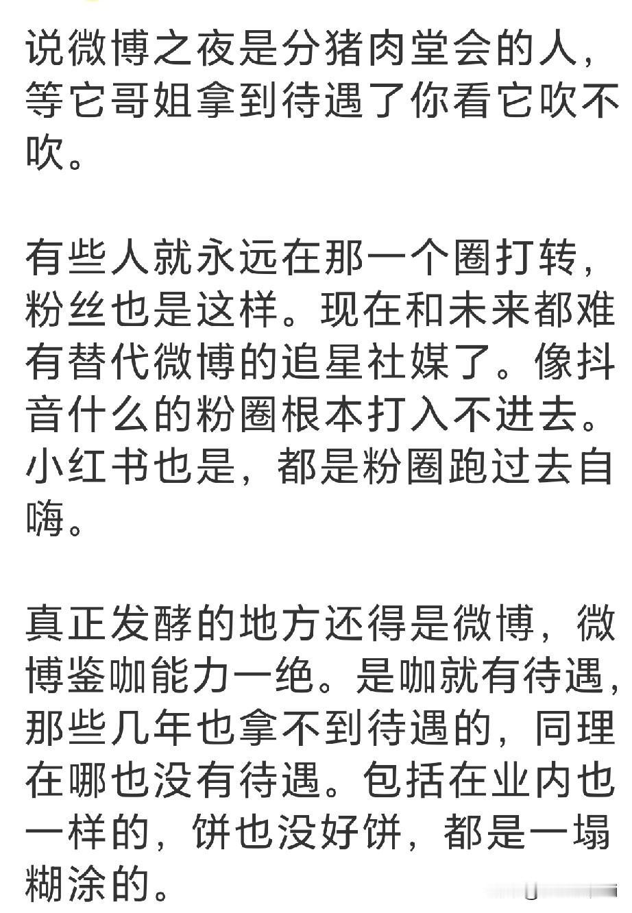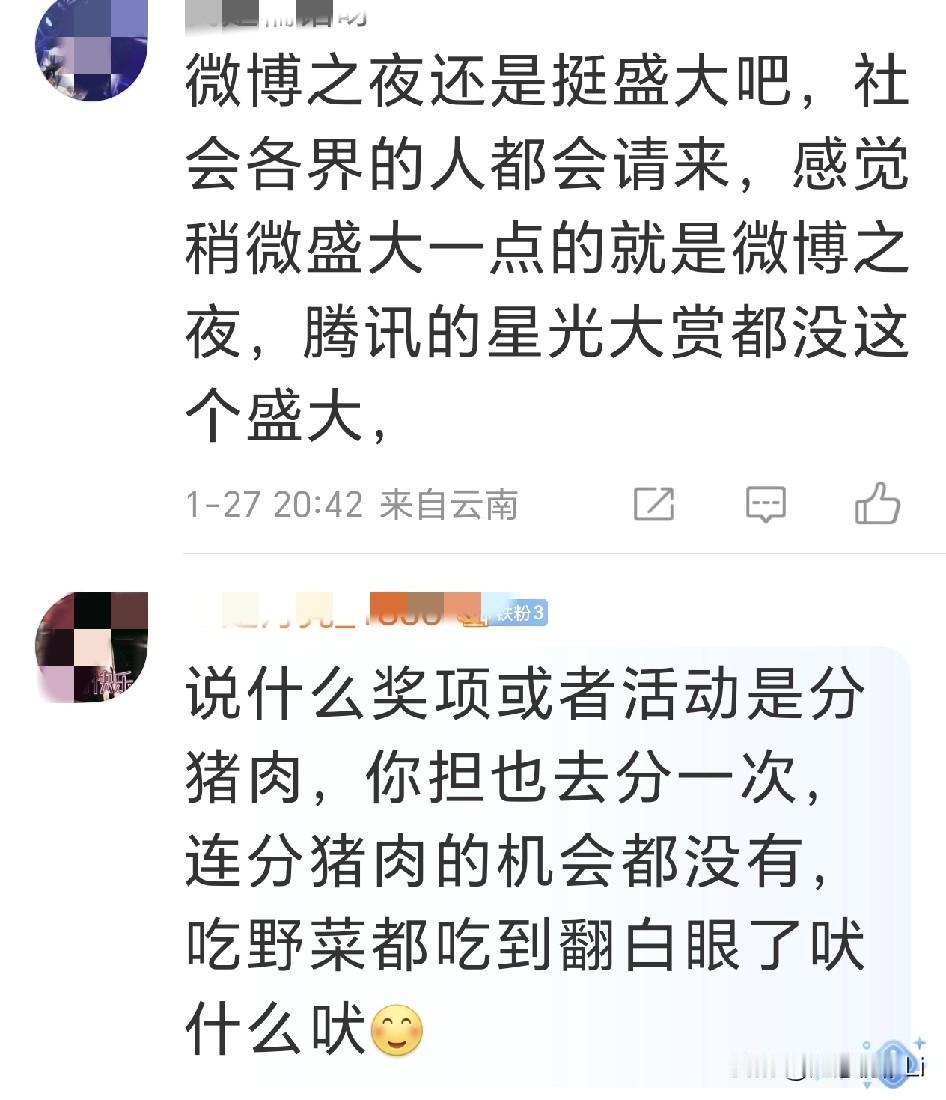 微博之夜每年不但上星播出,而且主持人还是央视的主持人,是真正的咖位和作品火爆与否的鉴别现场,没有论资排辈和世俗面子,你最红咖位最高,今年作品最火爆,热度最高,位置就最好,和谁一起领奖也是咖位高低和业内评价的风水岭,是后续资源的风向标。如果咖位足够高,平台就会足够重视,这种双向尊重,明星一般都会给微博这个面子去的,即便再忙