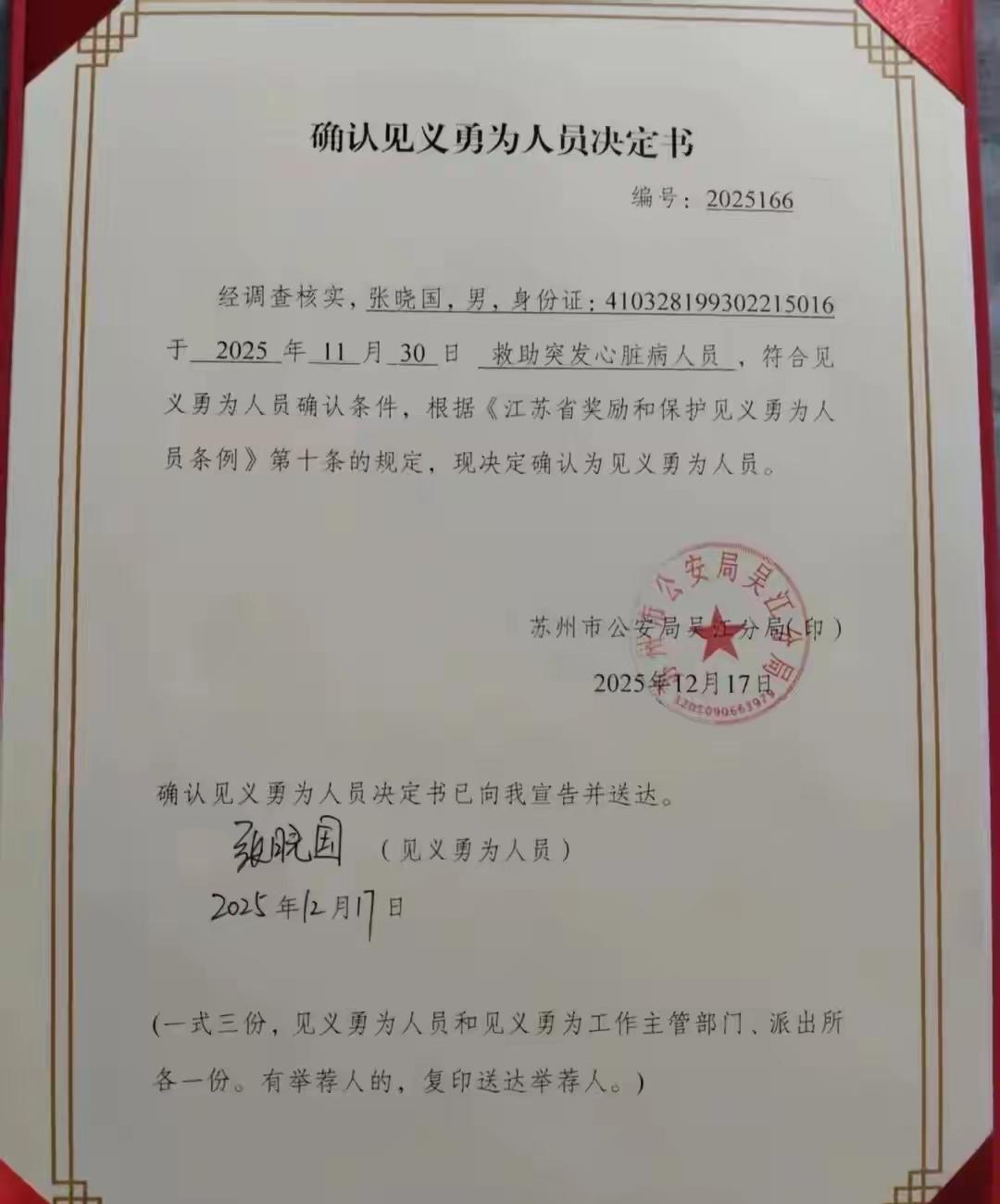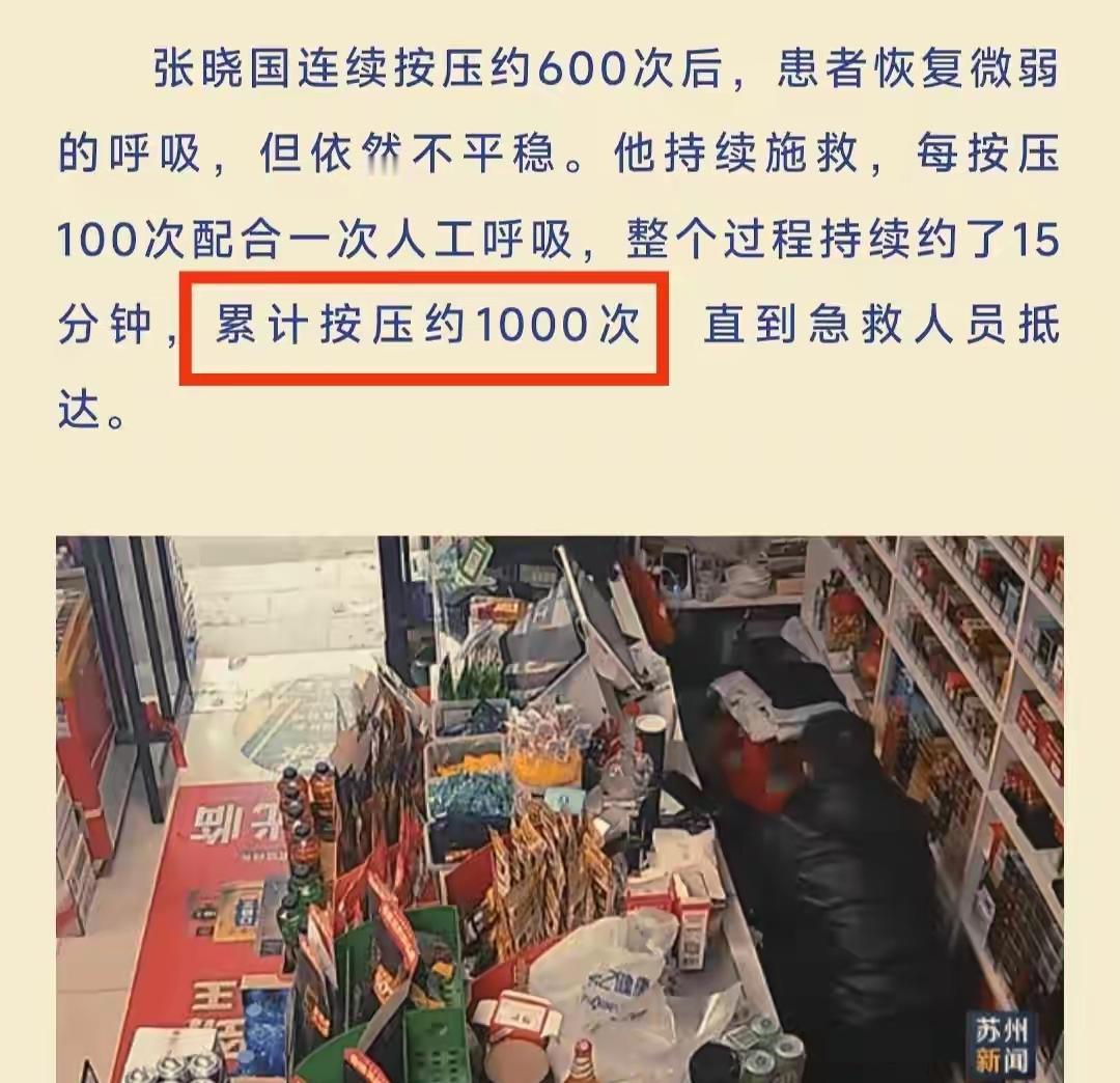 “谁说好心没有好报?”江苏一位超市老板娘就是因为少收了顾客一元钱,结果没想到最后救了自己一命。 2025年11月30日,江苏苏州,小伙张晓国下班以后来到附近的一家小超市,买了一盒烟后准备结账离开。 结账时老板娘看到张晓国找零钱,就主动的说:“算了,一块钱就不要了!” 张晓国感到非常的暖心,毕竟在外地打工,碰到不认不识的老板娘,非常大气豪爽,虽然一元钱不多,但是让人感觉非常的感动。 他抬起头对着老板娘说谢谢,说老板娘心善,肯定生意兴隆,财源广进这样的话。 没想到话没说上两句,张晓国就突然看到老板娘突然晕倒,摔在了柜台里面。 他吓坏了,一边大声喊人,一边跑进柜台里面,查看老板娘的情况。 老板娘直接没有意识了,怎么叫也没有回应,看样子呼吸心跳都停止了,这可把张晓国吓坏了。 他掏出手机赶紧拨打了120急救电话,一边说明情况报告位置,一边在接线员的指导下临时充当急救员,给老板娘进行心肺复苏。 在等待医生到来的15分钟里,张晓国一停没停的做着胸外按压,大概按压了600多次,自己都不知道最后给人家压折了6根肋骨。 虽然断了6根肋骨,但是老板娘的丈夫过后也是非常感恩,“如果不是小伙子这样抢救,人早就没了,还说什么断了肋骨啊!” 由于张晓国的及时救援,医生来到以后迅速接力,最终老板娘抢救成功,最后恢复了健康。 这才是好人有好报!如果不是因为老板娘免了一块钱,张晓国也不会和她多说几句话,当时头也不回的走了,老板娘倒在店里没人发现,呼吸心跳停止几分钟,后果可想而知。 网友们看到这个新闻,也是夸赞张晓国的体力是真的好,一般人真的做不到这个程度,即使是医生也有很多人做不到,不是好体力的人做不来。 对于张晓国的救人举动,他的父亲也是习以为常了,说儿子已经是第三次救人了,这是应该做的。 对于他的这种见义勇为行为,苏州市公安局给他颁发了证书,认定了他的这种好人好事行为。 不过也有人为他捏了一把冷汗,如果人没救回来怎么办?碰到不说理的人怎么办? 扶不扶?救不救?很多人都害怕了,想做好人好事,但是成本太高了,坏人太多了,你想救人做好事,而他人想讹人要钱,寒了很多人的心了。 大家说对于这样的事情,见到后会不会救人?