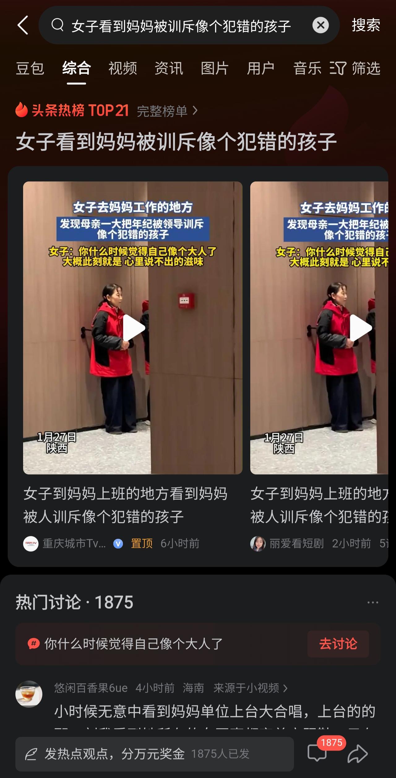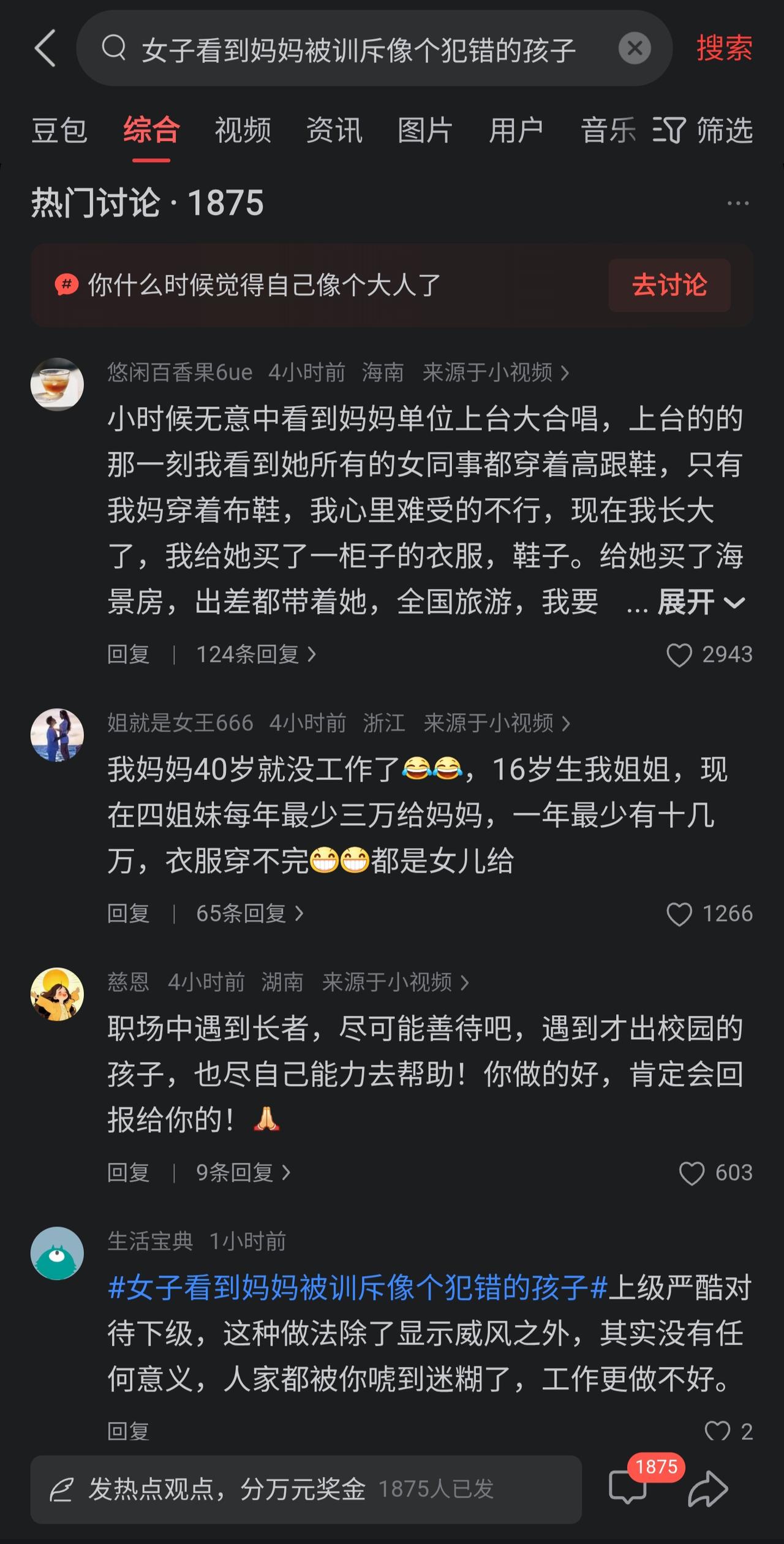 看到这则视频心里很有感触,头条推荐的话题“你什么时候觉得自己像个大人了”非常精准而且应景。 忽然想起来高中的一个语文老师给我们讲过的话,时间很久了但是现在还记得特别清楚。他说有的时候成长是一瞬间的事,在他上高中的时候有一次跟着母亲去外地,到了外地的一个车站肚子饿了,就跟母亲说想吃烧饼,因为在外地不熟悉环境,他看到母亲一脸局促和茫然的样子,这时候才知道父母并不是无所不能,也跟自己一样有胆怯、无助的一面,那一刻忽然感觉成长了。 后来想想自己,大概也是一样,小的时候处处依赖父母,忽然有一天发现父母也有无能为力的时候,一瞬间可能就长大了。回到这个新闻里,可以看出拍摄视频女子的母亲应该是一个底层工作者,希望企业的管理者可以对年长者多一些包容、多一些尊重,古话不是教导我们“老吾老以及人之老”吗。 这也告诫我们这些做子女的,工作、生孩子后应该可以越来越感受到做父母的不易,在自己力所能及的范围内多多关心父母。 你什么时候觉得自己像个大人了