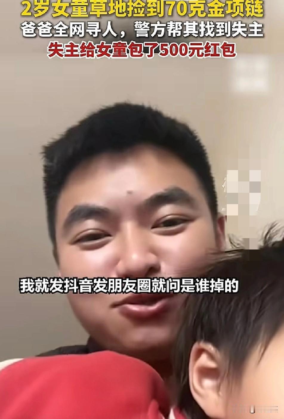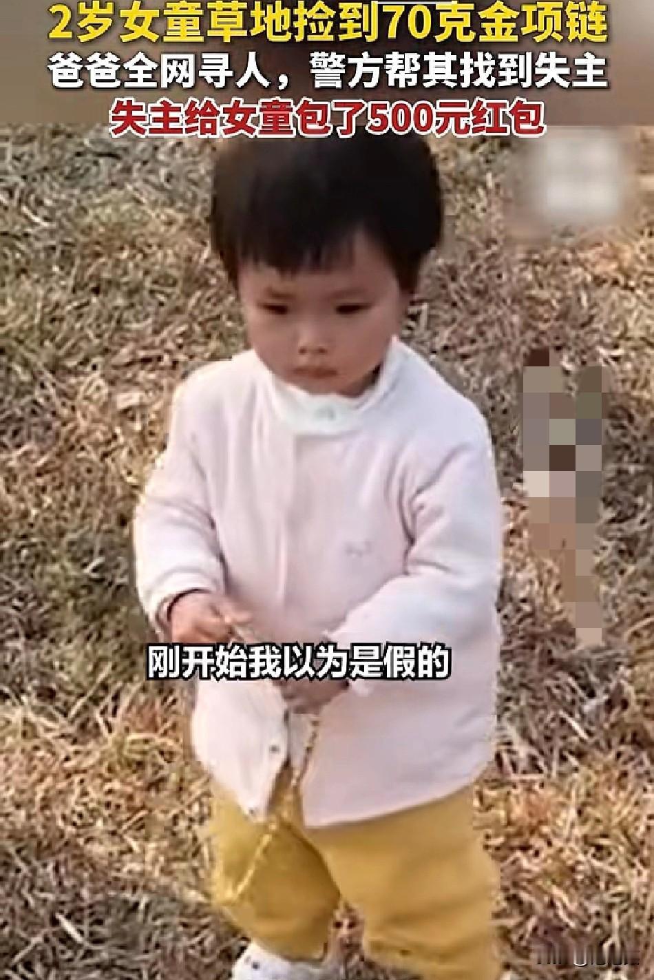 萌翻! 1月27日广东佛山 2岁女娃在草地玩耍时,随手捡到一条70克的金项链 爸爸原本以为是玩具,用火烤后才发现是真金 立刻发抖音、朋友圈全网寻人,还求助了警方 很快民警就联系到了失主,原来项链是失主散步时不慎掉落的 物归原主后,失主特意给女娃包了500元红包 爸爸说“这是给孩子最好的‘拾金不昧’教育” 其实最好的教育,就是藏在生活里的每一个善意瞬间 你家娃遇到过类似的“小意外”吗? 人活一辈子,最重要是什么