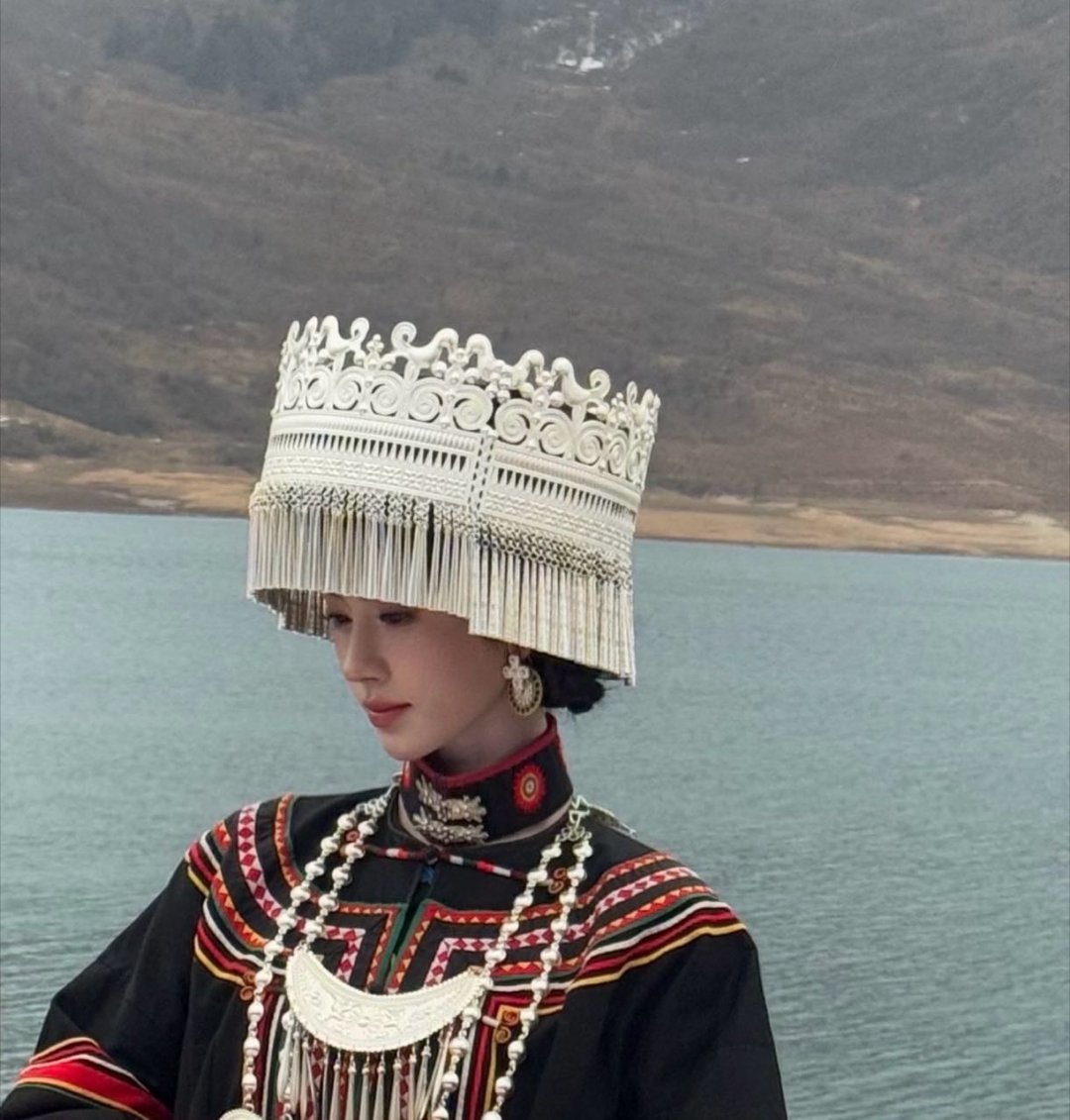 网友在成都冶勒湖偶遇鞠婧祎,彝族造型