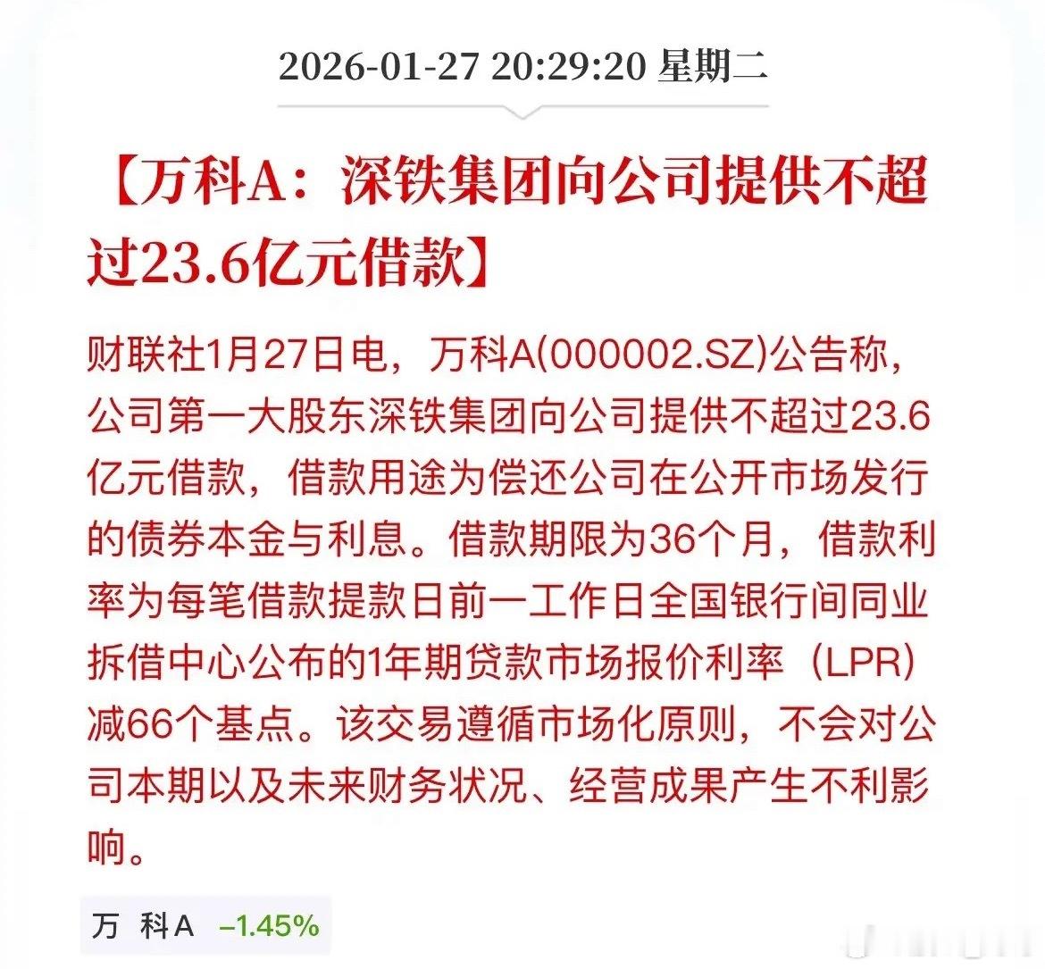 万科利好,债券展期获得延迟,另外深圳地铁又再度给万科输血了,提供不超过23.6亿元的借款这算是让万科又缓了一口气了,钱有了,债还能拖一拖,过完年再说吧。