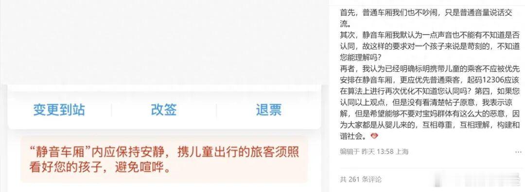 带娃宝妈被自动分配静音车厢【12306回应带娃仍被分到静音车厢】近日,有网友发文反映,自己已标明带着孩子出行,在12306平台购票后仍被分到了静音车厢。其介绍,购票时特地没有选择“静音车厢”,结果抢票完成后被告知自动安排到静音车厢。页面显示,标注“‘静音车厢’内应保持安静,携儿童出行的旅客须照看好您的孩子,避免喧哗。”该网友感到实在难安,“我家孩子属于安静的,但一点声音没有是绝对不可能的,这种该怎么办呢?”该网友建议,已经明确标明携带儿童的乘客不应被优先安排在静音车厢,应优先安排普通旅客,12306平台应在算法上进行优化。1月27日,12306客服称,静音车厢指的是车载的影视娱乐系统的音量关闭,自动广播的最高音量调节在40%以内,并引导旅客安静。在购票时,目前12306系统会随机分配,并不会识别和区分带孩子的旅客。如果有明确的座位要求,可以前往窗口购票,或选择没有静音车厢的班次。(都市快报)