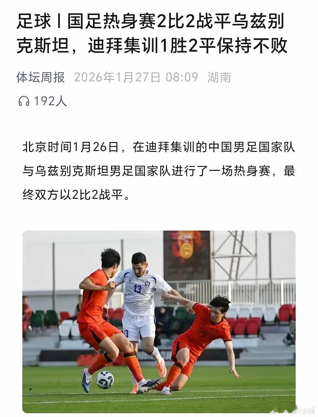 国足1胜2平结束迪拜拉练国足热身赛2:2战平乌兹别克斯坦,迪拜集训1胜2平保持不败,国足不愧是热身赛之王,希望等到了国际比赛日,踢正式比赛国足能有这样好的表现,值得一提的是乌兹别克已经打入今年的美加墨世界杯,主教练也是中国球迷很熟悉的卡纳瓦罗,希望今年夏天参加世界杯的乌兹别克能够代表亚洲在世界杯赛场有精彩的表现和发挥!