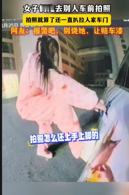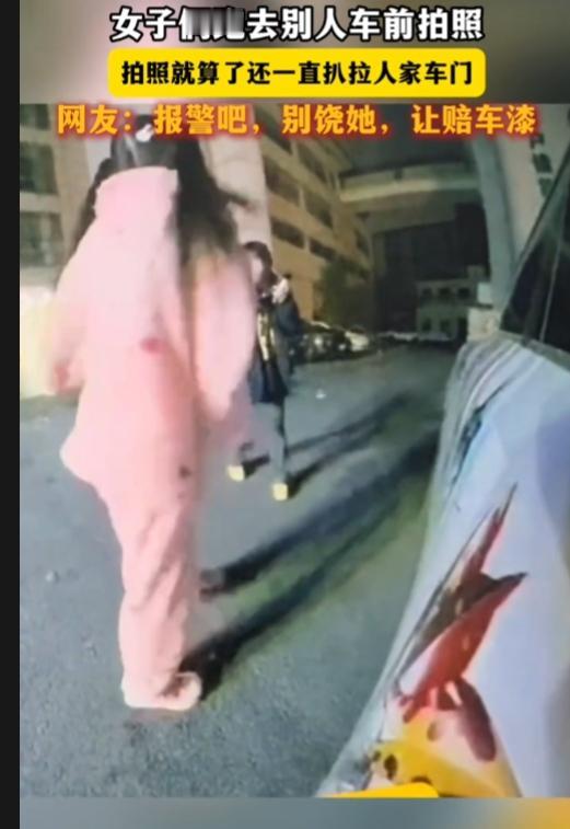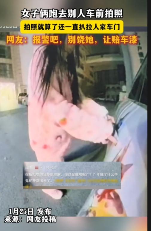 真是年底了,什么牛鬼蛇神都出来了。 两女子看别人豪车,不仅去车前拍照,还扒拉人家车门,扒拉不开,直接上脚借力拉。最后实在拉不开,才作罢。 双马尾粉红色睡衣,萝莉装扮,这智商,未成年啊!父母没教,别人的东西不能碰吗? 拍照就算了,还扒拉人家车门,偷盗啊!如果女子力气大一点,扒拉坏车门,打算进去坐一坐拍照,还是偷东西? 太给女人丢脸了,真是年底了,什么牛鬼蛇神都出来了。保留视频,报警,告她盗窃未遂,让她赔车漆!