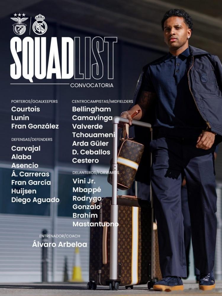 北京时间1月29日凌晨4:00,欧冠联赛阶段第8轮,皇马将客战本菲卡。赛前,皇马官方公布本场比赛大名单,维尼修斯和姆巴佩领衔锋线,贝林厄姆坐镇中场。皇马本场比赛大名单如下:门将:库尔图瓦、卢宁、弗兰·冈萨雷斯后卫:卡瓦哈尔、阿拉巴、劳尔·阿森西奥、卡雷拉斯、弗兰·加西亚、赫伊森、迭戈·阿瓜多中场:贝林厄姆、卡马文加、巴尔韦德、琼阿梅尼、居莱尔、塞巴略斯、塞斯特罗前锋:维尼修斯、姆巴佩、罗德里戈、贡萨洛·加西亚、卜拉欣·迪亚斯、马斯坦托诺