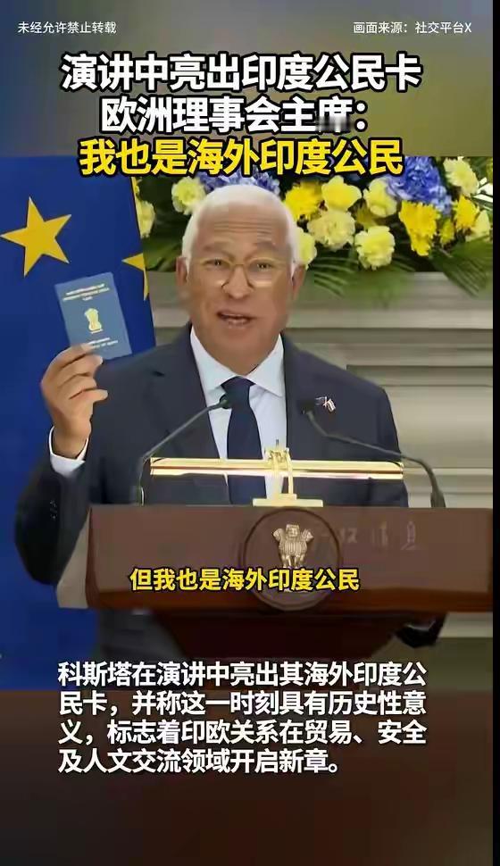 欧洲理事会主席演讲中亮出印度公民卡 印欧刚签完自贸协定,欧洲理事会主席科斯塔就搞出大动静。在印度 - 欧盟峰会后的声明里,他直接掏出“海外印度公民卡”,激动地表示自己虽是欧洲理事会主席,也是海外印度公民,还说自己为根在印度果阿而无比自豪。 原来,2017年莫迪就给时任葡萄牙总理的科斯塔发了这张卡。科斯塔家族根源能追溯到果阿,他祖父在那出生生活。他这么做,一方面是强调自己和印度的联系,另一方面也是借这身份让印欧自贸协定更有亲近感,向世界表明印欧成了可靠战略伙伴,关系提升到新高度。