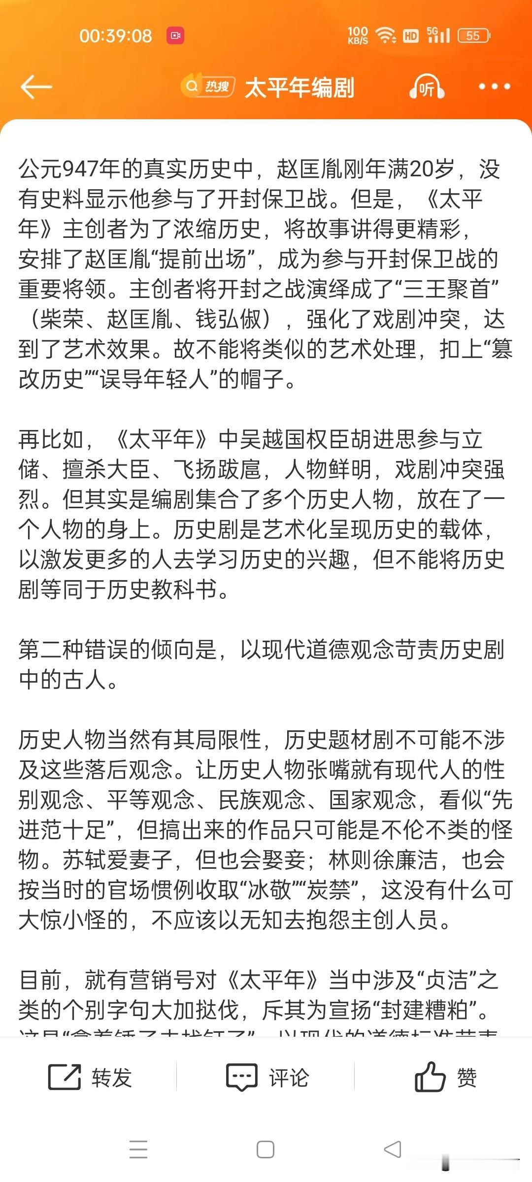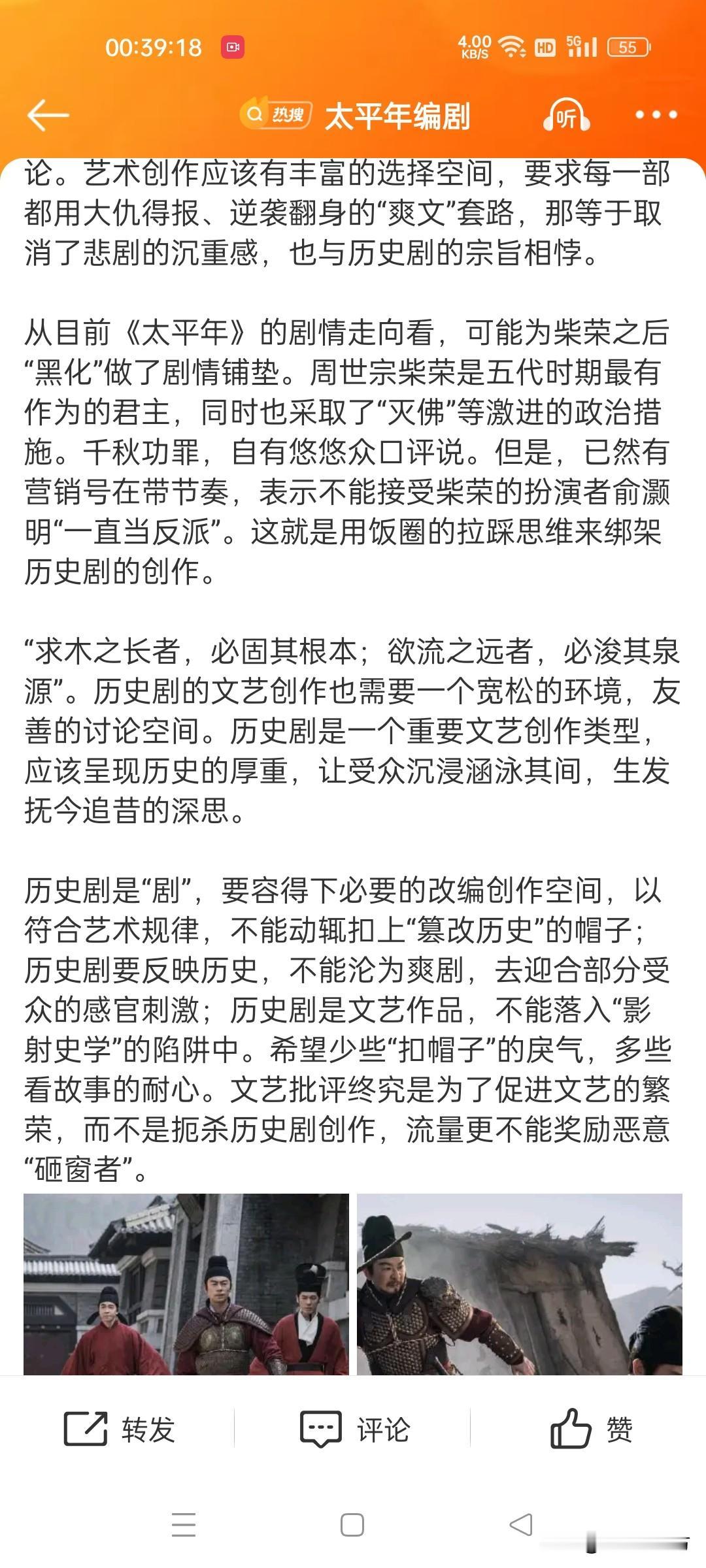 《澎湃新闻》难得写了一篇我认同的新闻评论——我是在提前看到大量自媒体负面评论之后半路上车看剧的。平心而论,单从军人盔甲、兵器严谨程度来说,也就《长安十二时辰》能比。而能做到投资巨大的盔甲兵器贴近历史,服化道的其它方面基本上就不用操心了。演员的表演也没问题,至于情节是最不需要议论的——历史剧≠历史,就如同《三国演义》≠《三国志》的道理一样。如果在历史剧里挑历史的茬,那过去拍的口碑好的历史剧,没一个是合格的。那《三国演义》就该扔锅灶里烧了!能这么干吗?显然不能!为了以后能继续看到制作精良的历史题材剧,就不要不负责任的批评了——因为你每一句不负责任的批评,都会等同于自绝未来历史好剧的可能——多少年没看到如此精良画面的历史剧了,投这么多钱,花这么大代价都落不到一句好话,人家以后谁还愿意干吃力不讨好的事呢?