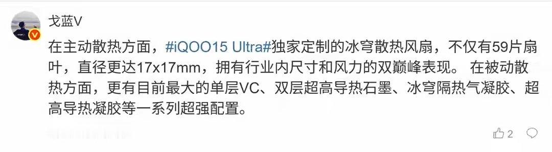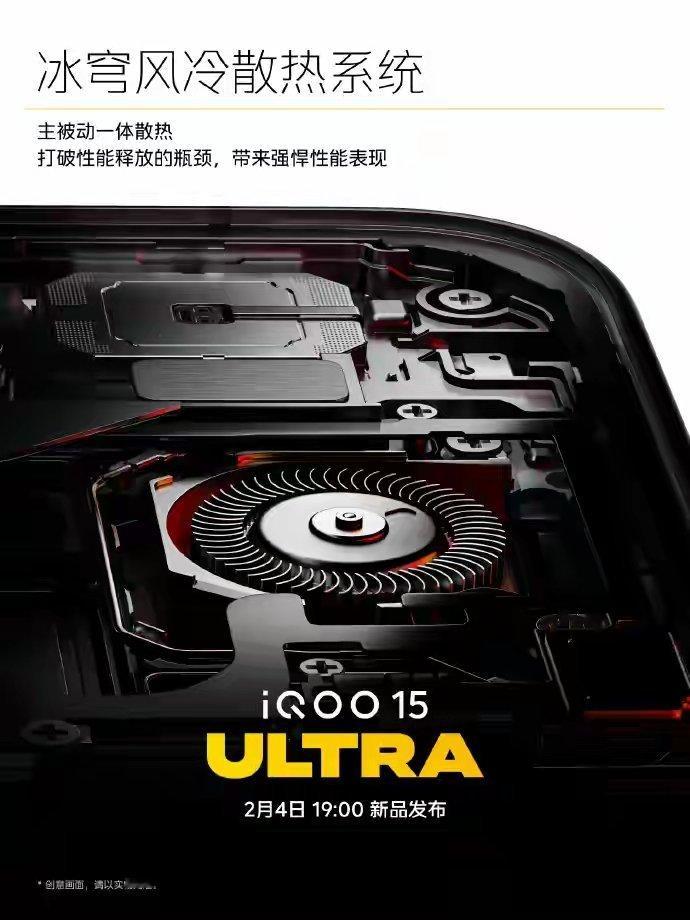 【iQOO 15 Ultra手机将发布,散热等配置亮点多】iQOO 官方在微博预热旗下 15 Ultra 手机,新机将搭载主被动一体式「冰穹风冷散热系统」,号称能带来“跨代性能表现”,2 月 4 日晚 19 点整发布。结合 iQOO 产品经理 戈蓝V 今日发文,这款手机搭载的独家定制冰穹散热风扇不仅有 59 片扇叶,直径更达 17*17mm,拥有目前更大的单层 VC、双层超高导热石墨、冰穹隔热气凝胶、超高导热凝胶等配置。据IT之家此前援引官方爆料,iQOO 15 Ultra 手机还将拥有「未来舱」后摄模组 + 全新「能量光刃」灯效,主打“简约优雅”的效果,号称“为极致玩家而生”。新机还搭载全新 Texture on Fiber 技术,辅以六边形蜂巢纹理能量矩阵设计,可随手机角度流光涌动。据数码闲聊站透露 iQOO 15 Ultra 新机的配置,具体如下:性能:骁龙 8 Elite Gen5 处理器 + 自研电竞 Q3 芯片规格:顶配 24GB+1TB屏幕:6.85 英寸 2K LTPO 三星大直屏影像:前置 32Mp 镜头 | 后置 50Mp+50Mp+50Mp 3X CIPA 4.5 潜望长焦镜头组合散热:内置主动散热风扇玩法:压感肩键续航:7400mAh 电池 | 100W 有线快充 + 无线充音质:1115 同轴对称双扬马达:091640 双轴马达安全:超声波指纹设计:「未来舱」DECO + 全新「能量光刃」灯效
