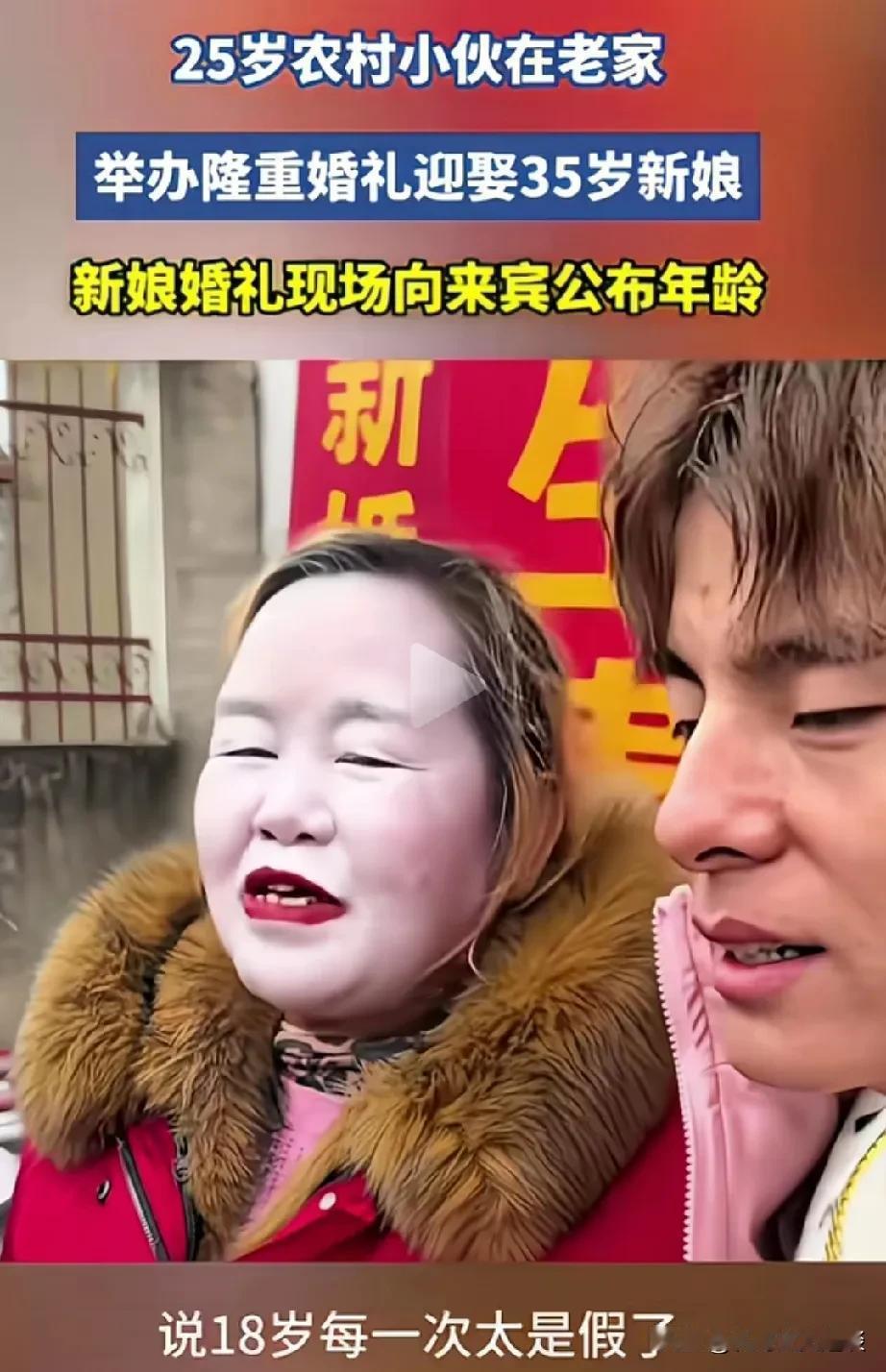25岁小伙娶35岁新娘,村里人直呼不可思议。小伙子在老家举办婚礼,引得全村人都来围观,看西洋景似的。村里人在现场围着问新娘多大,新郎随口一说,18岁。新娘说18岁太假了,她说她35岁了。 网友看到新娘直呼不可思议,她要是35,我当然说过了。新郎说18岁,她自己说是35岁,网友说我看她53岁还差不多。 网友问,娶这样的老婆有什么用?也不能生育了,娶回来给她养老吗?不知道小伙子年纪轻轻的是怎么想的?