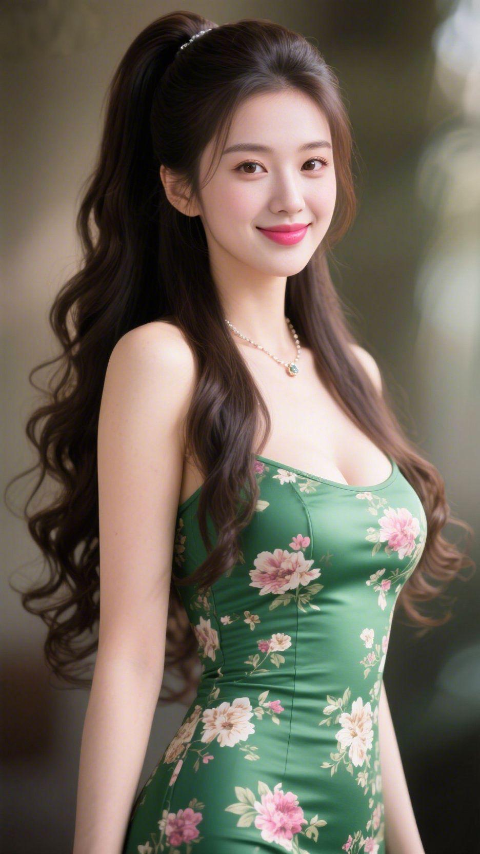 《青裙衔春》 软风裹着晴光漫过来时,她正立在光晕里。墨发松松束作高马尾,几缕卷梢垂在肩侧,随轻浅的呼吸微微晃着。 一身青裙像揉开的春涧碧色,缎面泛着润软的光,粉白花瓣错落缀在裙身,恰似把院角初醒的花枝裁作了衣。颈间细链坠着颗浅绿晶石,衬得眉目愈发明朗,笑意落进眼底时,连空气都浸了温甜。 本是寻常的午后闲时,因这抹清润的青、这束舒展的笑,便成了心头轻摇的软景——像檐下晃着的竹影,像茶瓯里浮着的春芽,慢得恰好,柔得刚好。 春日轻暖 衣间春景