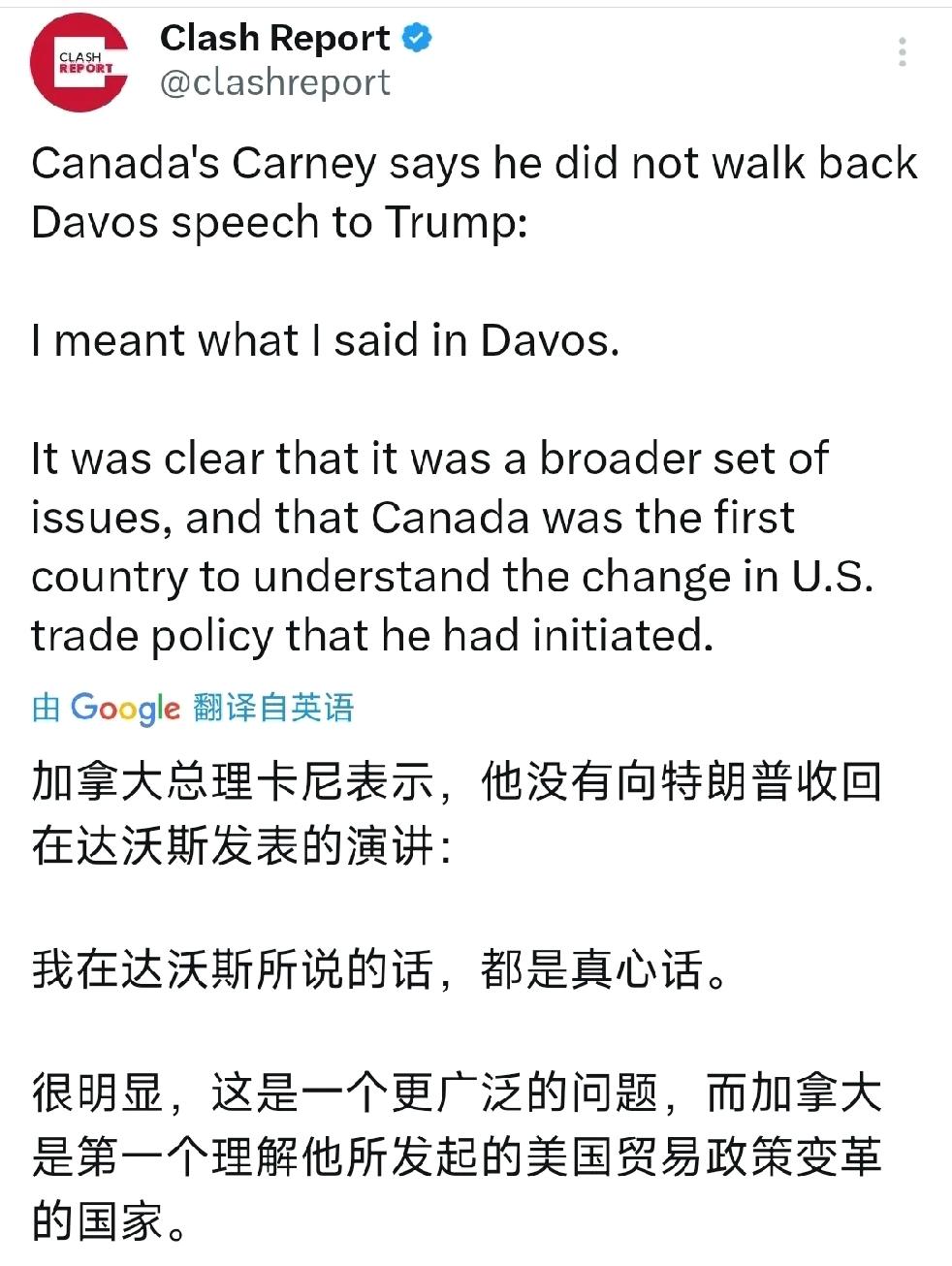 1月28日,卡尼回应美财长言论,我没收回在达沃斯发表的演讲。卡尼表示:“我在达沃斯所说的话,都是真心话。很明显,这是一个更广泛的问题,而加拿大是第一个理解他所发起的美国贸易政策变革的国家。” [机智]卡尼拒绝收回达沃斯演讲,不是硬气是加拿大的无奈觉醒。从2025年美加贸易战美方加税至35%,到特朗普叫嚣加国成“第51州”,加75.9%对美出口的经济软肋被反复拿捏,安大略省3.8万制造业岗位流失就是代价。卡尼直言美国将经济一体化武器化,恰是看透霸权本质:加拿大曾三次反制美关税、祭出600亿报复清单,却难抵单边施压。如今他加速贸易多元化,对华签300亿加元矿产协定、原油出口目标提至10%,所谓“理解美贸易变革”,不过是中等国家在霸权夹缝中,为自己找的生存破局之道!