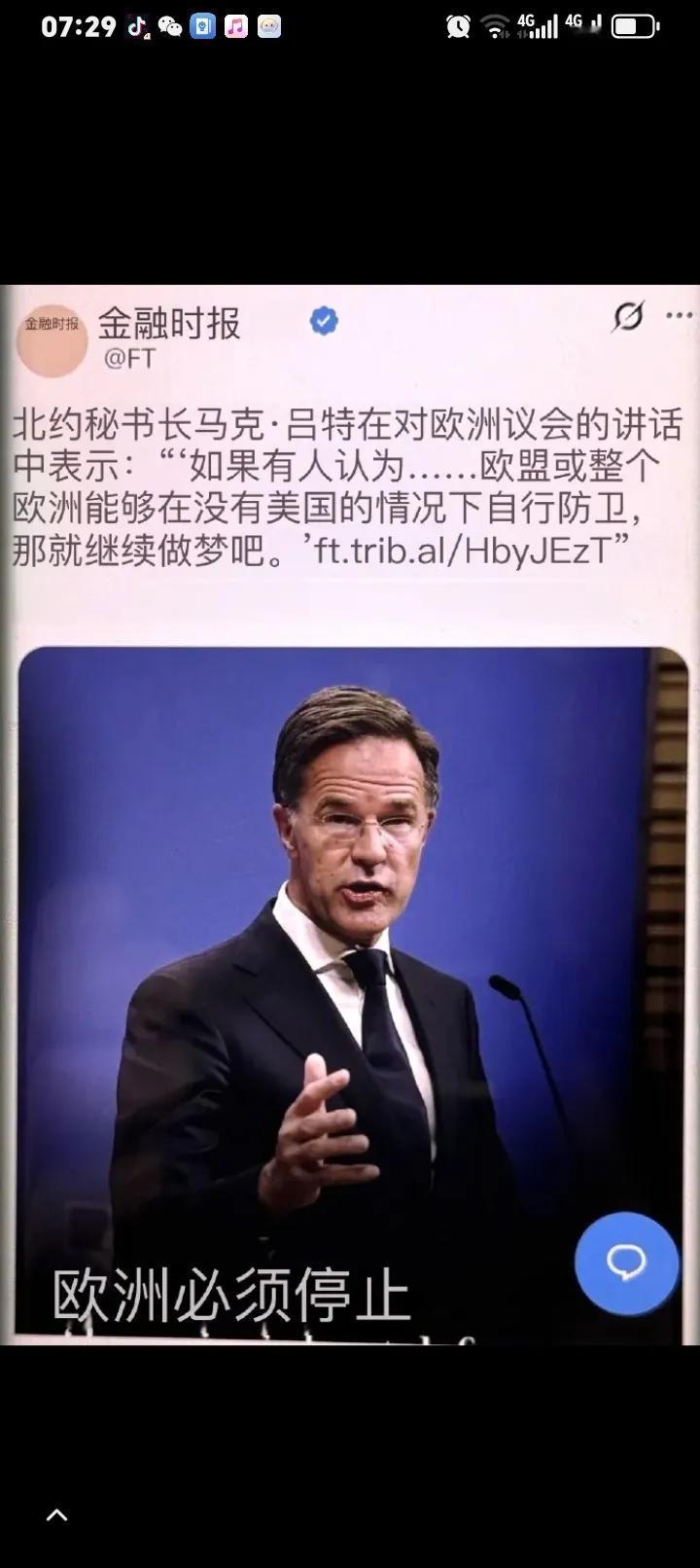 此人称为欧洲历史上最大的“欧奸” 他曾认特郎普为爸爸 他曾为特郎普的让“美国再次伟大”而摇旗呐喊 他为达到特郎普的百分之5军费规定在欧州四处游说施压 他如今又警告欧州,如果认为没有美国的帮助而自行防卫是做梦 这就是荷兰前首相,如今北约秘书长,如假包换的欧州人! 唉,每个国家在各个历史时期都有或明或暗的卖国求荣者。中国历史上宋朝的秦桧,袁世凯,近代的汪精伪,他们可有与马克.吕特一比?