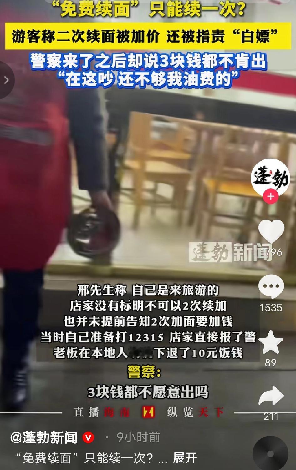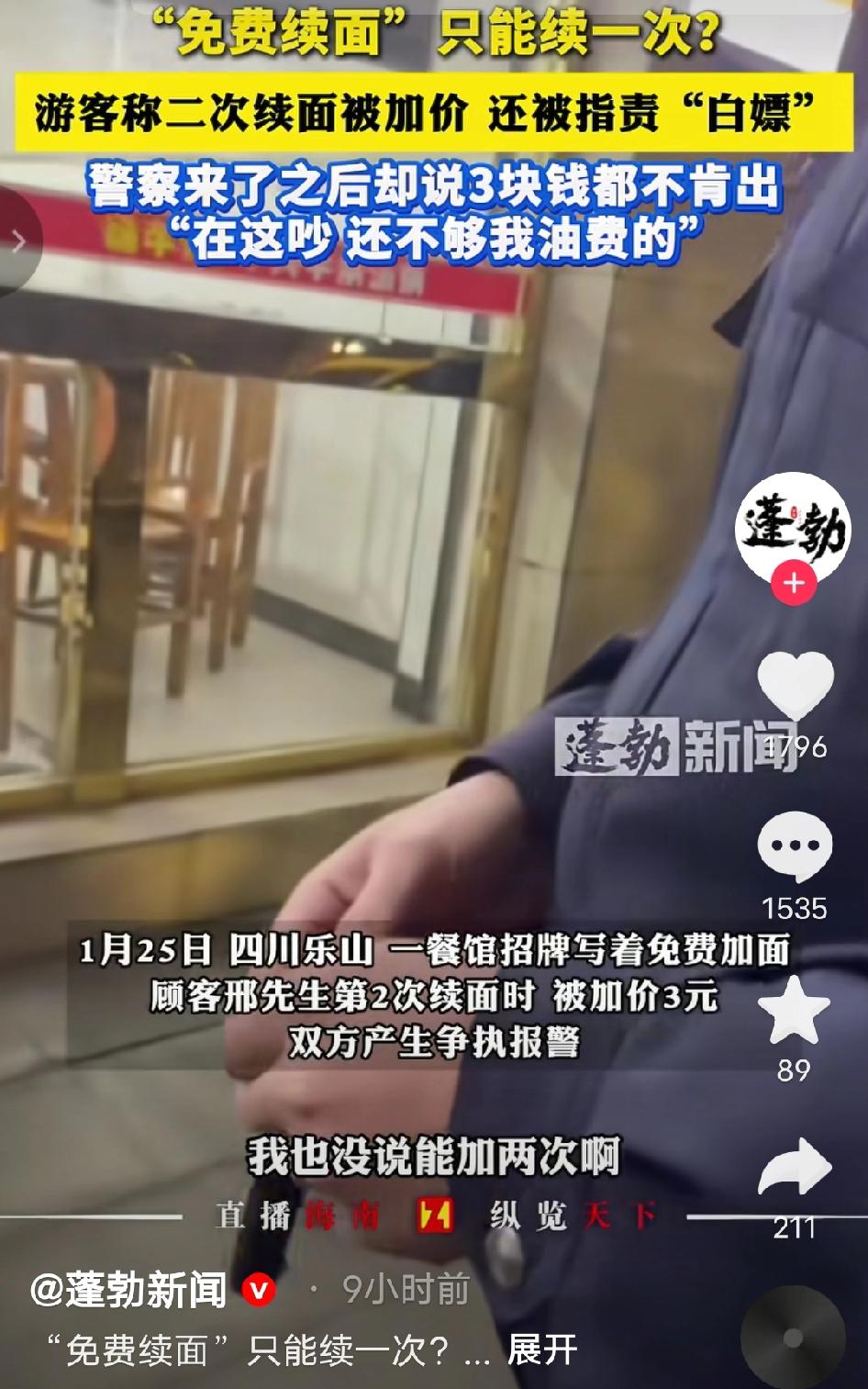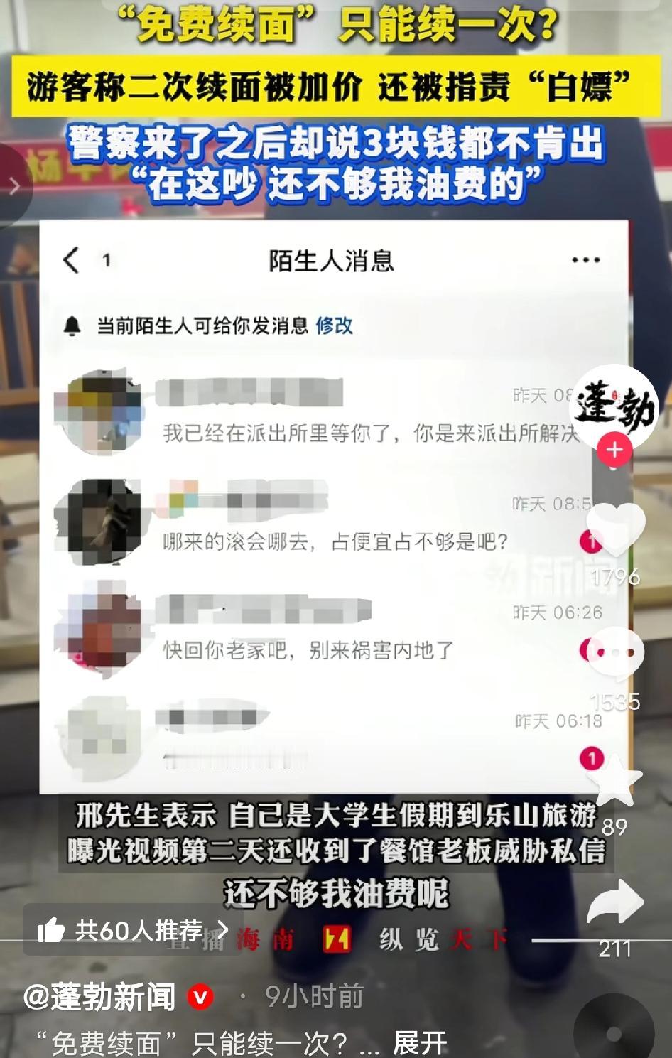 “乐山摊上大事了!”大学生去吃 面,面馆招牌写免费加面,可他第 二次续面却要收费3元!大学生不 服,民警来了以后,可居然帮着老 板怼大学生:“你3块钱都不愿出 吗?这点钱还不够我开到这里的油 漆!” 邢先生直到离开乐山,想起那碗面还一肚子气,更让他寒心的是店家后续的恶意——不仅当面翻脸辱骂,还追着私信人身攻击。 那天中午,逛完景点饿得肚子咕咕叫的他,被街边面馆“免费续面”的红色招牌吸引,进店就点了一碗10元杂酱面,酱香飘得老远,可面条分量实在单薄,浅浅一碗铺着层肉酱,几口就扒拉完了。 他照着招牌喊老板续面,老板闷头从后厨端出一小份热面,碗沿还沾着面汤,一言不发放在他桌上,全程没提任何限制;等第二碗见底,逛了一上午腿都酸了的邢先生,抬手又喊“老板,再续点呗”,这话刚落,老板手里的面勺“哐当”一声磕在锅沿上,脸瞬间拉得老长。 “续一次够了!第二次收3块!你这人想白嫖是吧?吃不起就别来!”老板隔着油腻的柜台扯着嗓子喊,唾沫星子都快溅出来,周围食客瞬间都看了过来,邢先生脸一阵红一阵白。 他盯着门口没半个“仅限一次”字样的招牌据理力争,老板却不耐烦地挥着手,语气更冲:“我们这的规矩!不懂就别在这胡搅蛮缠!”邢先生气不过摸出手机要打12315,老板反倒先抓起桌上的座机报警,扯着嗓门喊“有人吃霸王餐不给钱,还讹人! 十几分钟后,民警骑着警车赶到,刚进门就撞见两人争得面红耳赤,听完双方掰扯的前因后果,民警皱着眉盯着邢先生,语气带着不耐烦:“3块钱都不愿意出,在这吵半天.我这一趟油费都比这贵!” 这话一出,邢先生更委屈了,当场红了脸辩解:“警官,我不是不出钱,是他招牌没写只能续一次,第一次续面也没说,现在倒骂我白嫖,这不是欺负外地人吗?” 旁边几位本地食客看不下去,纷纷帮腔:“老板没写清楚规矩在先,不能怪游客”“外地来旅游的,哪知道你们这私下的规矩”,民警听完没再吭声,老板脸红的从抽屉里摸出10元零钱,“啪”地拍在桌上,邢先生攥着钱,又气又无奈:“我不是差这3块钱,是你这态度太欺负人!” 回到酒店本想着发个社交平台提醒其他游客避坑,他特意拍了面馆招牌和付款记录,配文说清来龙去脉,谁料第二天一早,私信箱就弹出一条恶评,点开竟是面馆老板:“哪来的乡巴佬滚哪去,占便宜没够是吧?” 这事一经曝光,网上瞬间炸了锅。网友热评刷屏: 有网友说“真的气笑了!招牌写免费续面又不标次数,这不就是明摆着坑人吗?外地游客好欺负是吧” 也有网友说“3块钱事小,老板那态度太恶心了!理亏还骂人,事后还私信威胁,真给乐山丢脸” 还有网友说“最气的是民警还帮着店主说话!3块钱是小事,游客是被坑还被骂,换谁不较真?这不是欺负外地人吗” 对于这个事情你怎么看呢? 乐山面馆续面纠纷 免费续面陷阱 旅游消费维权 民警吐槽名场面 老板威胁游客 争议民生 来源:蓬勃新闻及网络公开内容,如有侵权请联系即删 配图说明:本文配图/视频素材来自@蓬勃新闻 ,仅用于内容分享,侵权联删