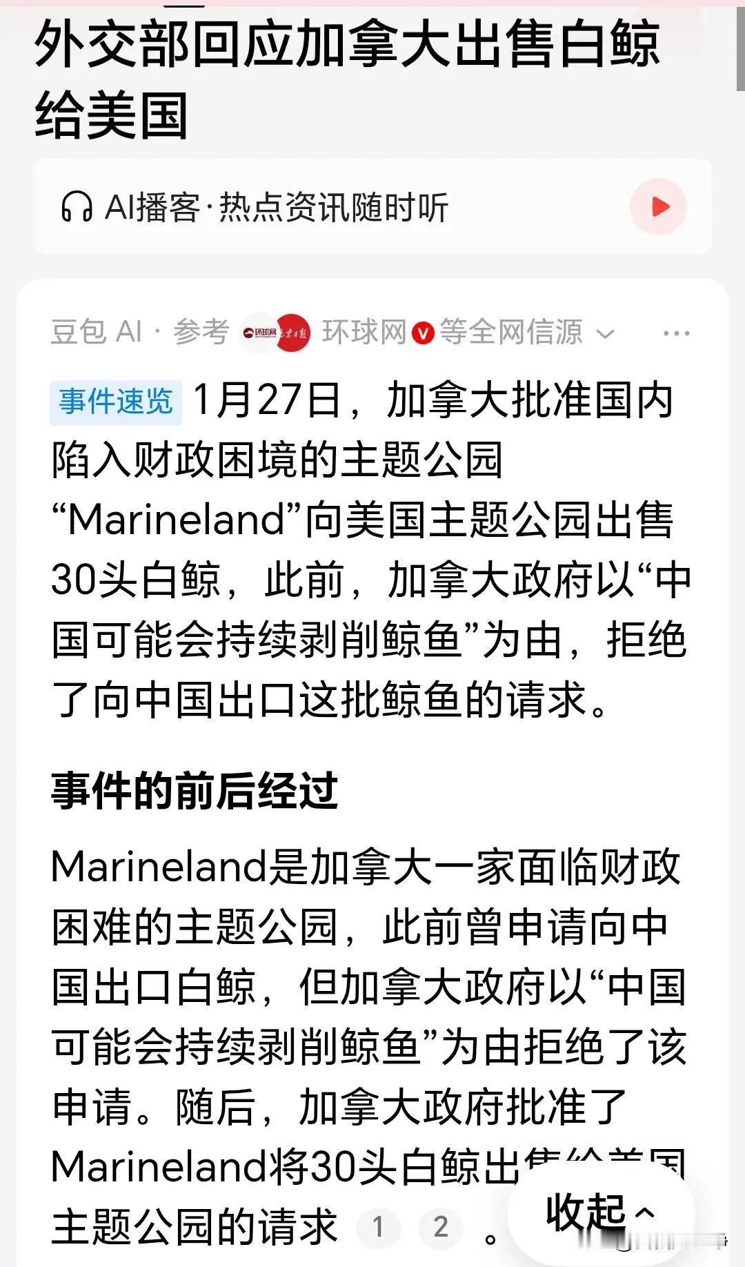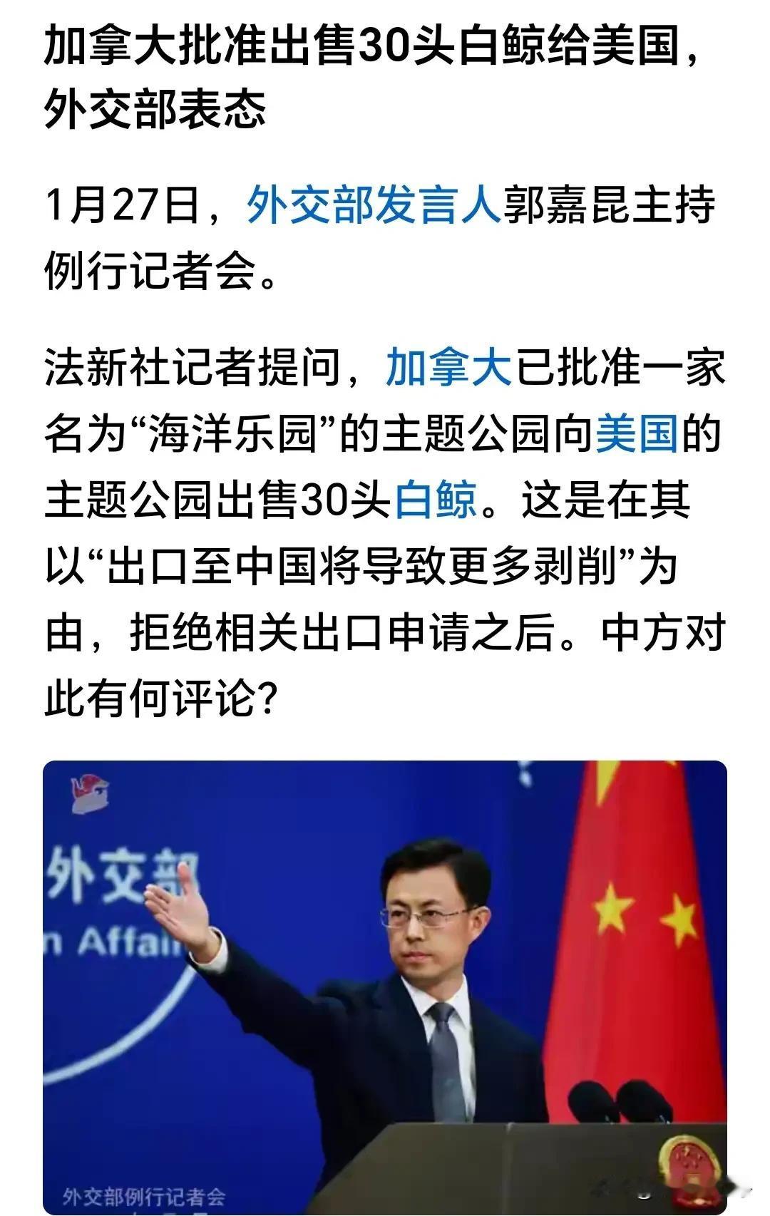 加拿大30头白鲸怎么就成了新闻热点呢?这事情的起因挺复杂的。 还是去年的时候,加拿大有一家主题公园陷入到了财政危机。 公园里面有30头表演用的白鲸。 他们已经养不起了,而且没有买家。 如果找不到买家的话,他们就只能安乐死了。 由于数量比较庞大,客户群体太少,所以最后加拿大公园对外表示可以赠送。 因为他们毕竟不想背上一个杀白鲸的罪名嘛。 有人说了,为什么不野外放养呢? 没有办法了,这批白鲸养的时间太长了,早就已经丧失了野外生存的能力。 那个时候咱们深圳的一个公园递来了橄榄枝,说我可以接手这些白鲸,帮你们养起来。 甚至可以支付一部分费用。 加拿大这家游乐园终于找到救命稻草了,赶紧向加拿大政府递交了申请。 结果万万没有想到,加拿大政府直接就给反驳了。 理由是中国会剥削这些白鲸的。 因为他们会让白鲸表演节目。 哎哟我去,这些白鲸在加拿大主题公园里面就是表演节目用的。 给你们这些白皮表演,这就不叫剥削。 送到深圳去表演,这就变成剥削了? 最后宁可安乐死,也绝对不把这些白鲸送到深圳去。 这是去年的一个新闻,好了,现在事件有了转机,有了最终的句号 美国的一家公园接手了这些白鲸 这个时候加拿大政府不说剥削的事情了。美国公园嘛,想干嘛就干嘛 毕竟流浪汉都能变成高达零件,做成高达提取物 剥削几只白鲸,自然就不是什么问题了 所以交易当场通过。 1月27号就有法新社的记者向咱们外交部发言人问到了这个问题。 咱们发言人根本就不搭理,直接一句话,我不清楚具体的细节,无可奉告。 潜台词就是,加拿大和美国爱干嘛就干嘛吧。 咱们中国文化里有一个观念是非常重要的,叫做听其言,观其行。 咱们最近刚刚跟加拿大签署了很多的商业合作的文件。 舆论一片叫好之声。 但是国家的态度很冷静,还是那句话,听其言,观其行。 加拿大能不能真正的执行下去,这还两说呢。 估计那帮白皮们是很难好好执行的。 因为他们傲慢啊。