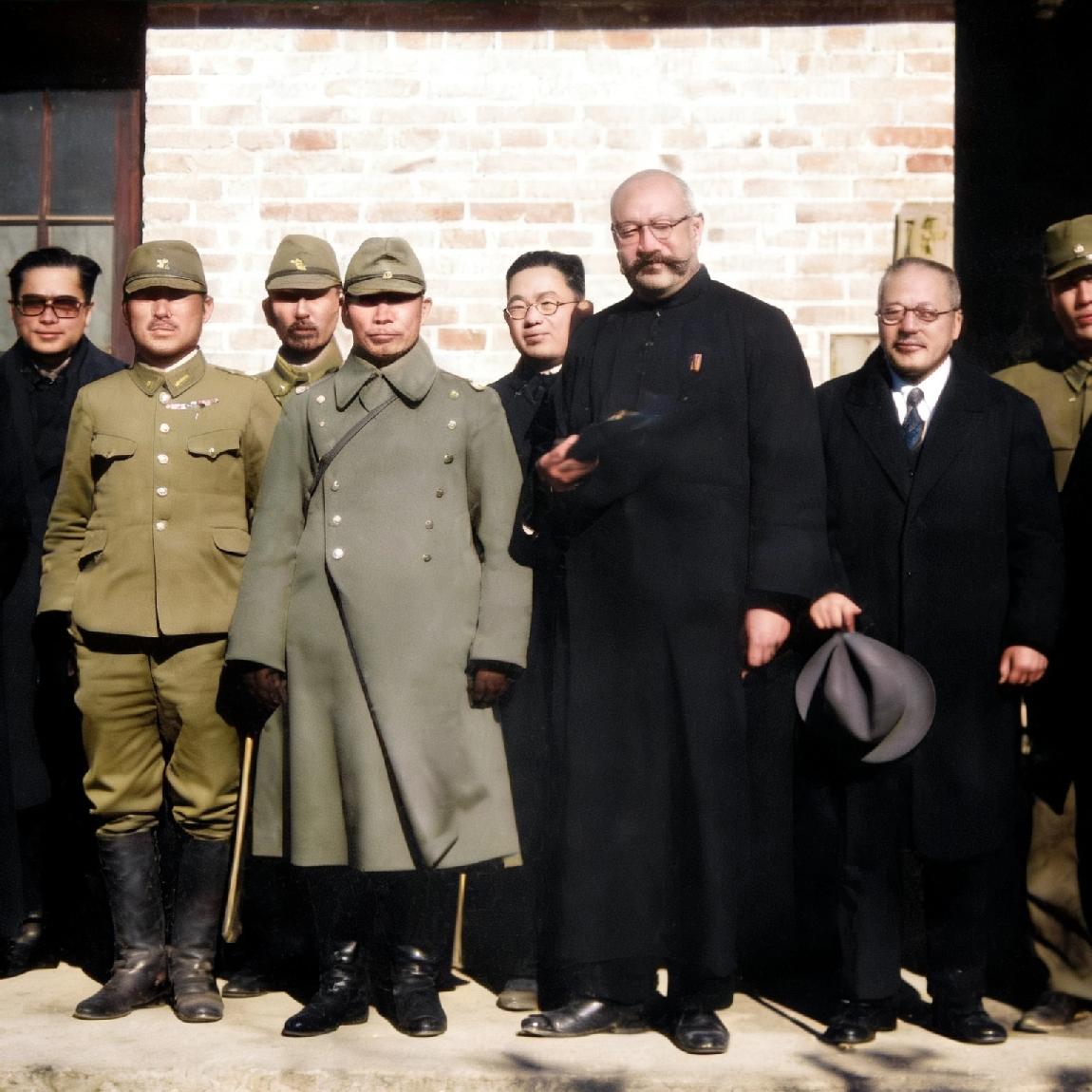 1939年,投靠日寇的唐仰杜,顶着“伪山东省省长”的头衔视察泰安等地,照片里的他身着笔挺中山装,一手攥着礼帽,摆出一副官威十足的模样,身旁簇拥着几个同样卖国求荣的汉奸,还有荷枪实弹的日军紧随左右,满眼都是狐假虎威的嚣张。 唐仰杜是山东邹城人,早年毕业于山东公立法政专门学校,一手书法着实见功底。民国时期他在山东官场混迹,可惜能力平平,仕途没什么起色,国民党接收济南后,他彻底赋闲在家。 可这家伙当官的执念太深,济南沦陷后,竟把投靠日寇当成翻身的跳板,靠着出卖民族利益当上了伪山东省省长。 掌权后的唐仰杜无恶不作,帮着日本人压榨同胞、掠夺物资。他的汉奸行径引来锄奸团的刺杀,虽侥幸逃过一劫,却吓得此后出门必带大批保镖,再也不敢单独露面。 1949年山东解放,这个卖国贼被押解到济南受审,1951年被判处死刑,终于为自己的滔天罪行付出了代价。