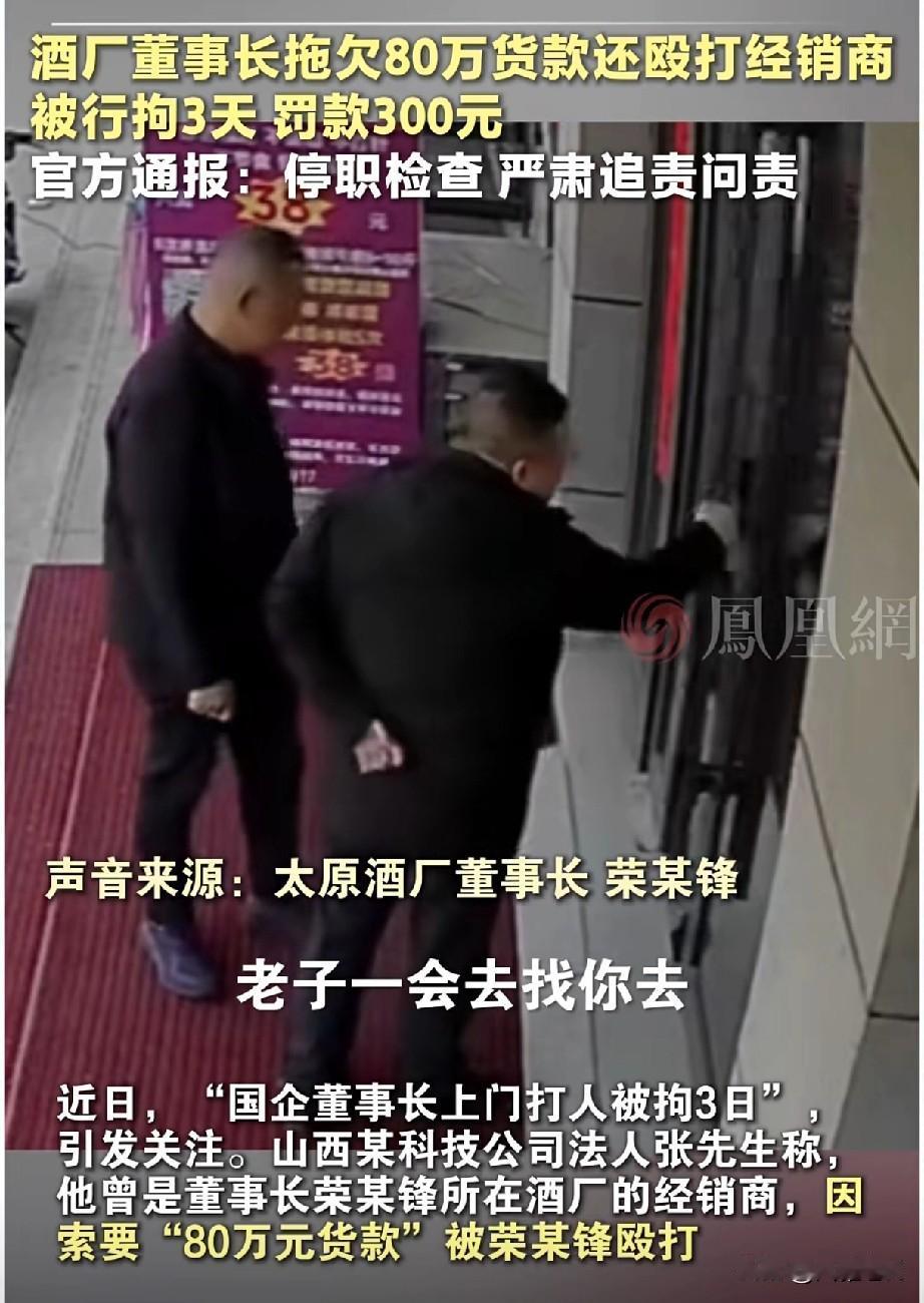 “堂堂一家国有企业,拖欠我们货款不给,董事长还找上门来将我打伤住院,试问哪有这样的道理!”——山西某科技有限公司法定代表人张先生,发出了这样的灵魂拷问! 网上流传的视频中显示: 2025年12月21日,打人者是太原酒厂董事长荣某锋,口出狂言:“等着老子哈,一会到你店里找你去” 结果,这位嚣张的荣董事长,倒也是说到做到,果真带着人找到了张先生,把张先生打致“全身多处软组织损伤”! 事件起因是企业货款纠纷问题,事件发生后,帽子介入调查,并对荣某锋行政拘留3日,罚款300元。 (信息来源:红星新闻、新浪财经、凤凰网、新华社权威报道)