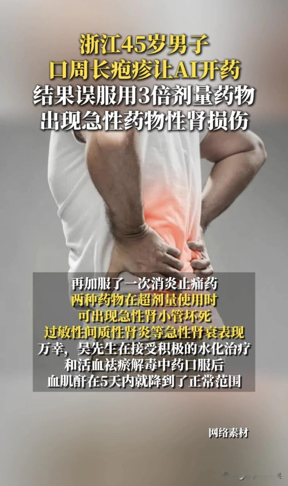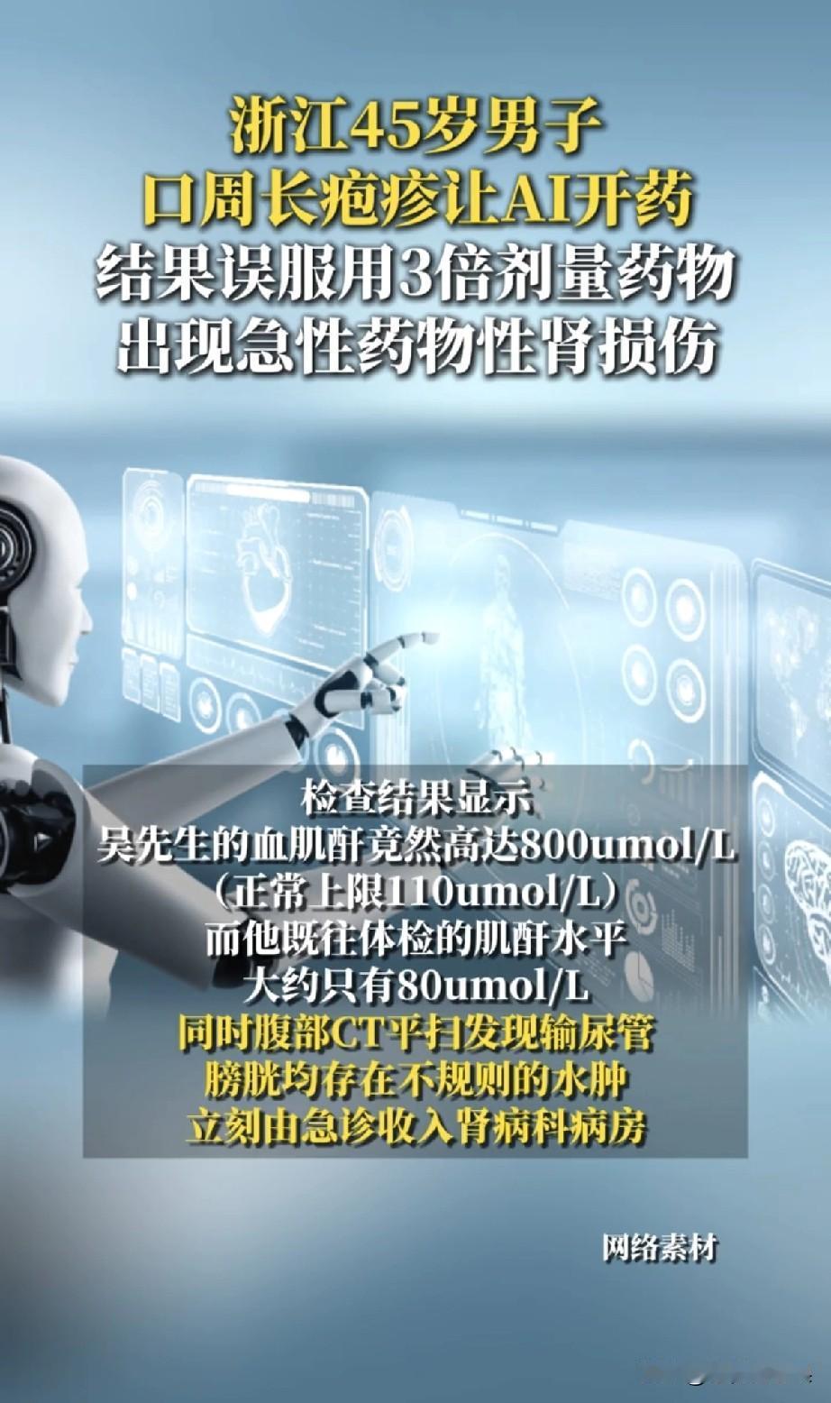 AI看病一句话,差点让他肾报废。 浙江吴先生只是嘴角长了个疱疹,他图省事用AI问诊,得到了“吃8粒伐昔洛韦”的建议。 谁能想到,AI只说了“粒数”,却没提“克数”——他买的进口药,单粒剂量是国产的3倍! 8粒下肚,等于一次性吃了3倍的正常药量。 更糟的是,之后他身体不适又叠加吃了感冒药,两种药物直接引发急性肾损伤。 送到医院时,血肌酐飙到800umol/L,是正常值上限的近10倍,输尿管和膀胱都水肿了! AI可以给你参考,但不能替代医生的专业判断。 身体不舒服别硬扛,吃药前一定要看清说明书上的剂量,几种药混吃更要咨询医生。 健康真的赌不起!别让图省事,变成了拿命冒险。