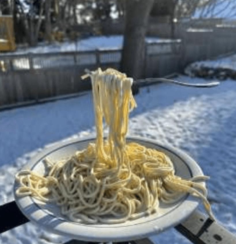 近日,美国遭遇猛烈冬季风暴“芬恩”(Fern)侵袭,严寒天气从中西部席卷南方及东北地区,多地气温急剧降至历史罕见水平。截至1月25日,风暴已造成至少7人死亡,超80万户家庭及企业停电,全国交通严重受影响,近半州份宣布进入紧急状态。 “芬恩”横扫多州,至少7人死亡,逾80万户停电。 极端低温下,一段“意大利面实验”意外成为网络热点。前明尼阿波利斯KMSP电视台气象主播珍妮佛·麦德梅(Jennifer McDermed),日前在社交平台X分享她在寒流期间做的简单实验,引发广泛关注。她把一盘意大利面连同叉子放在户外,在气温降至零下29摄氏度、体感温度低至零下43摄氏度的清晨,面条短时间内完全结冰,叉子悬在半空、凝固不动,画面宛如时间被冻结。