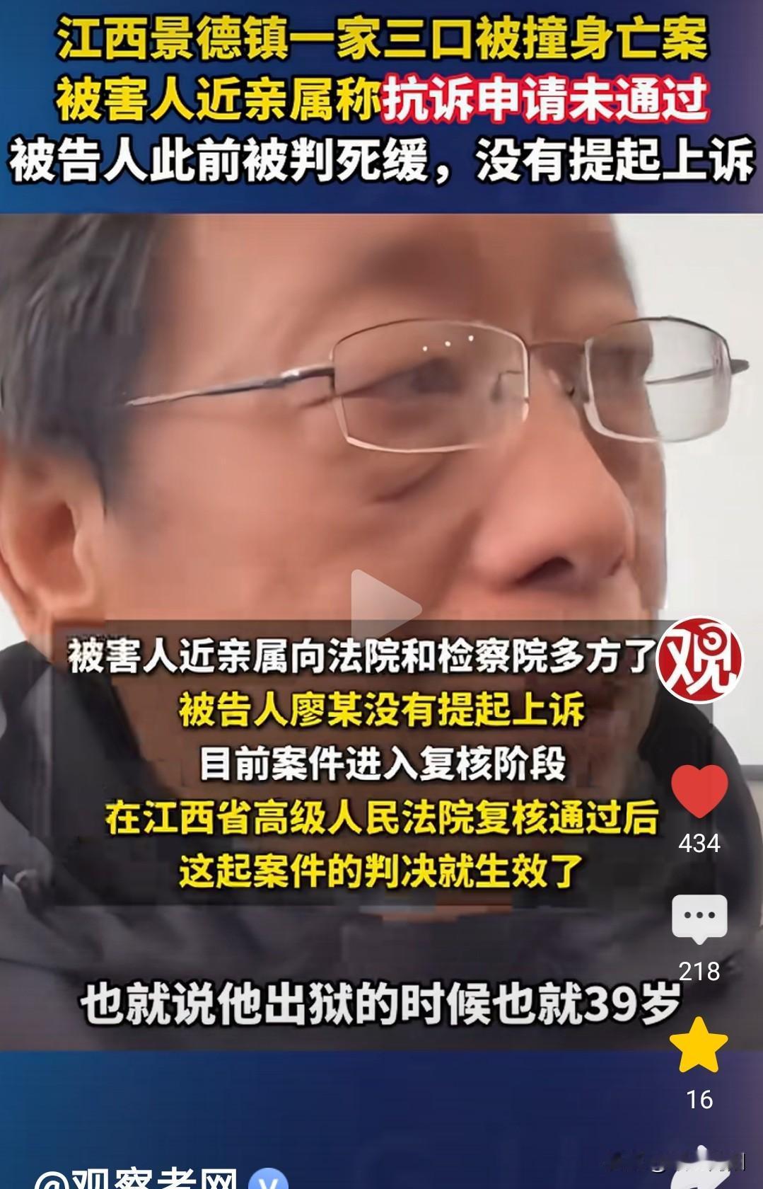 景德镇一家三口被撞身亡案,受害者亲属的抗诉申请被驳回! 这个案子太让人气愤了,廖某就因为和同车女朋友拌嘴,在市中心限速的主干道上把电门踩到100%,车速飙升到每小时129/公里,明显是放任后果的发生,这跟故意杀人有什么区别? 而胡某一家三口正步行过马路时,却被廖某的车撞得遍体鳞伤,一家三口当场身亡,就连不满周岁的小婴儿也没放过。给受害者亲属造成了灭门之灾,他的父母双亲一度陷入痛苦中无法自拨。 而廖某被判死缓,再过十几年就出来能正常生活了,而胡某一家三口再也回不来了,这对受害者太不公平了?