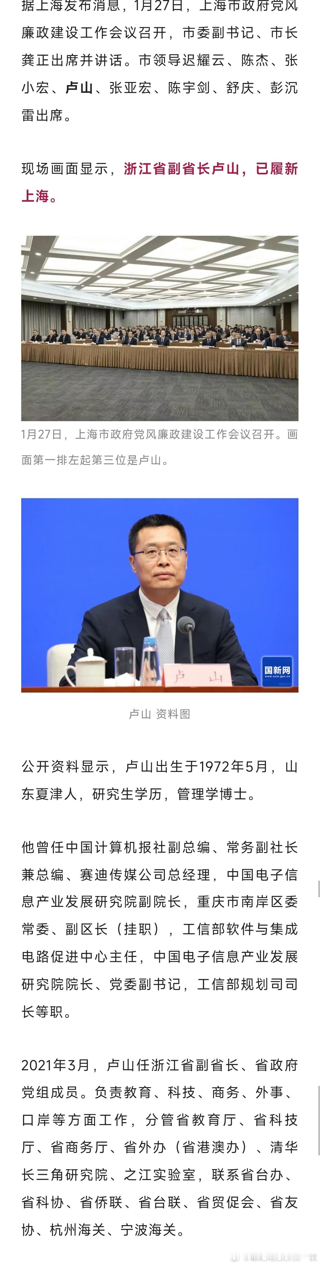 浙江省副省长卢山,已履新上海。