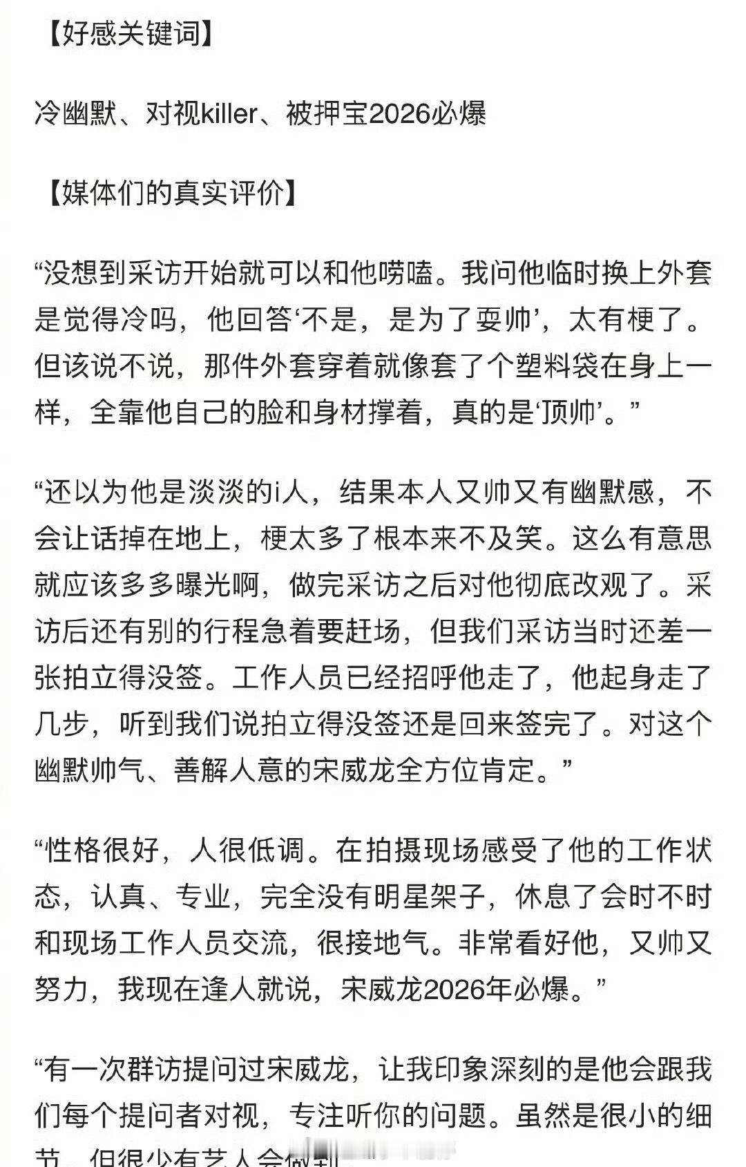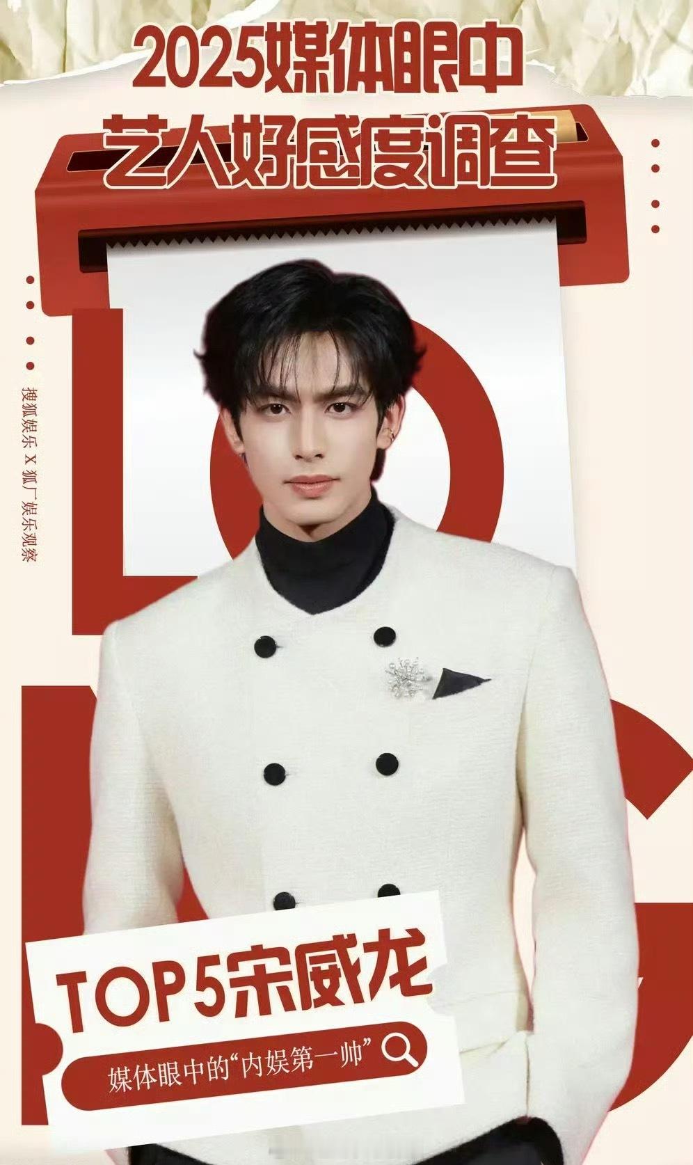 2025年媒体好感度艺人宋威龙上榜“很有梗、性格很好人很低调、会和记者对视很专注的工作”