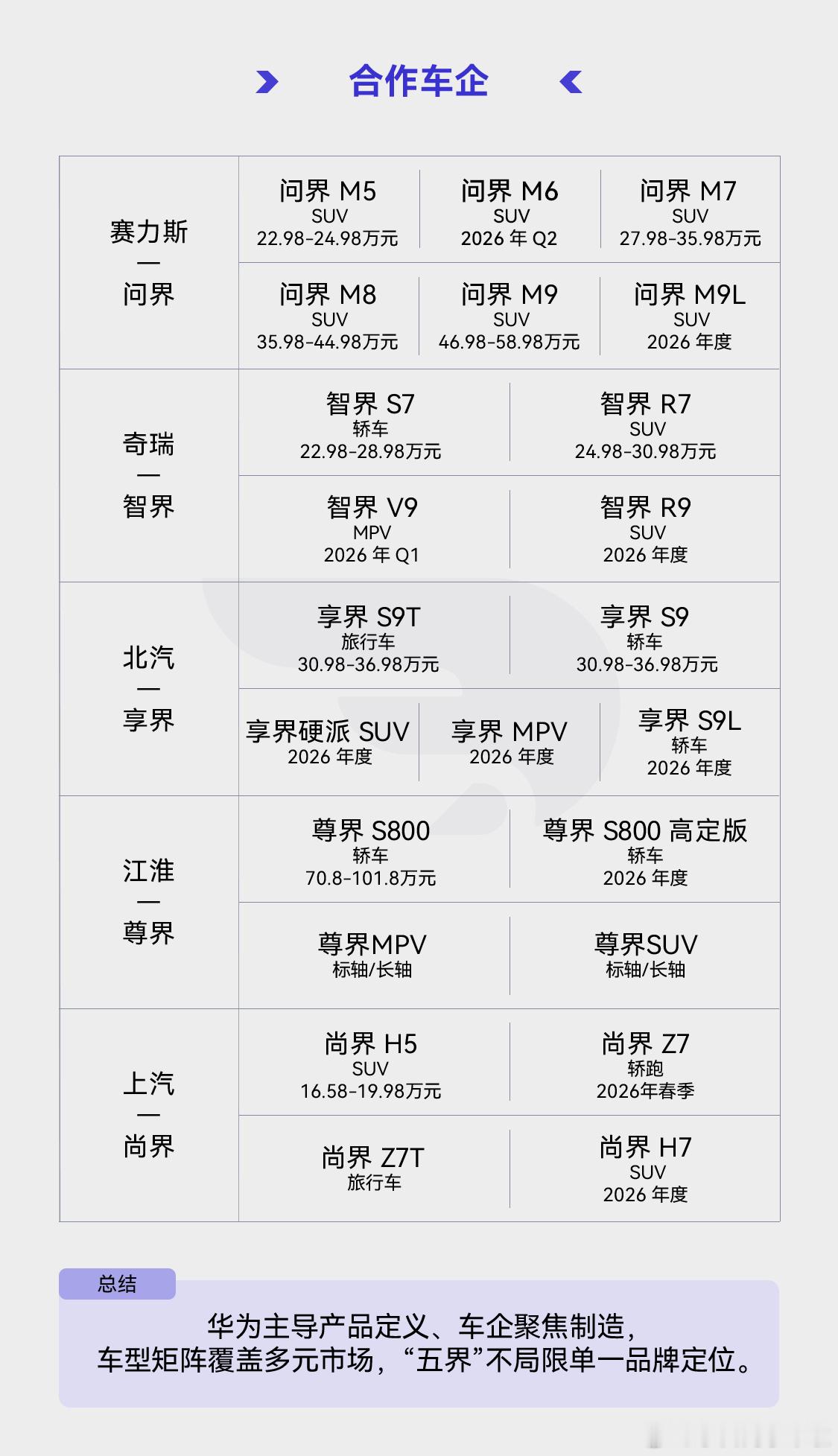同事今早上了一张华为与车企合作体系的一图,也就是鸿蒙智行、境系列和其它。鸿蒙智行依然是绝对的主力,产品布局非常完善。除此之外,同事还给出了今年鸿蒙智行会上的一些新品大致时间,包括问界 M6、智界 V9、R9、享界硬派 SUV 和 MPV、尚界 Z7 和 H7,感兴趣的大家可以参考下。鸿蒙智行大v聊车