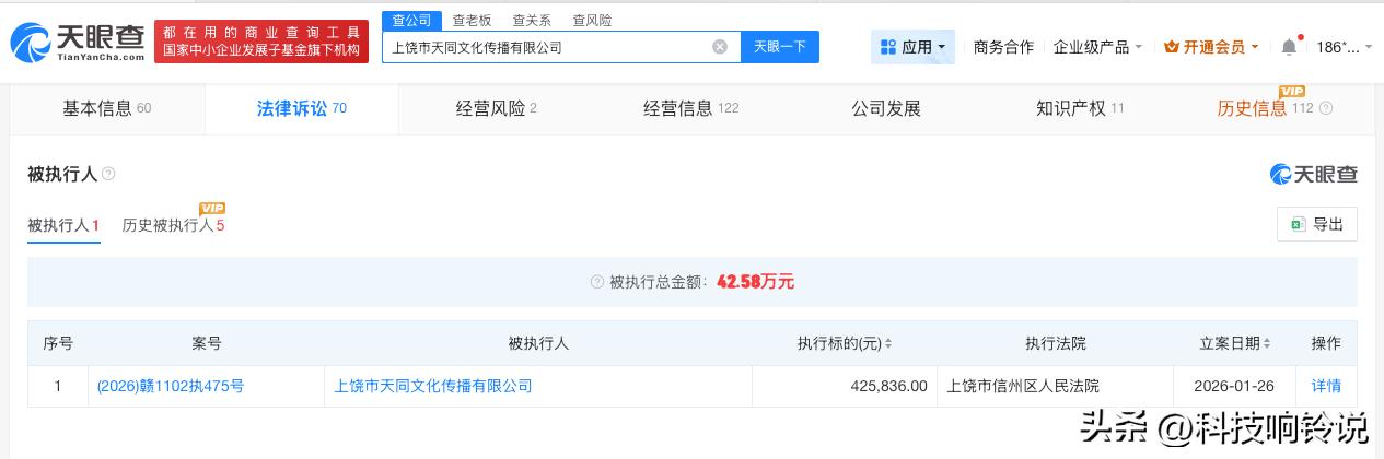 【RNG关联公司被执行42.5万 RNG关联公司被执行】 天眼查天眼风险信息显示,近日,上饶市天同文化传播有限公司新增一则被执行人信息,执行标的42.5万余元,执行法院为上饶市信州区人民法院。 上饶市天同文化传播有限公司成立于2018年12月,法定代表人为王俊飞,注册资本500万人民币,经营范围含互联网游戏服务、演出经纪、网络文化经营等。股东信息显示,该公司由上海竞心承峰传媒有限公司全资持股。 天眼查信息: