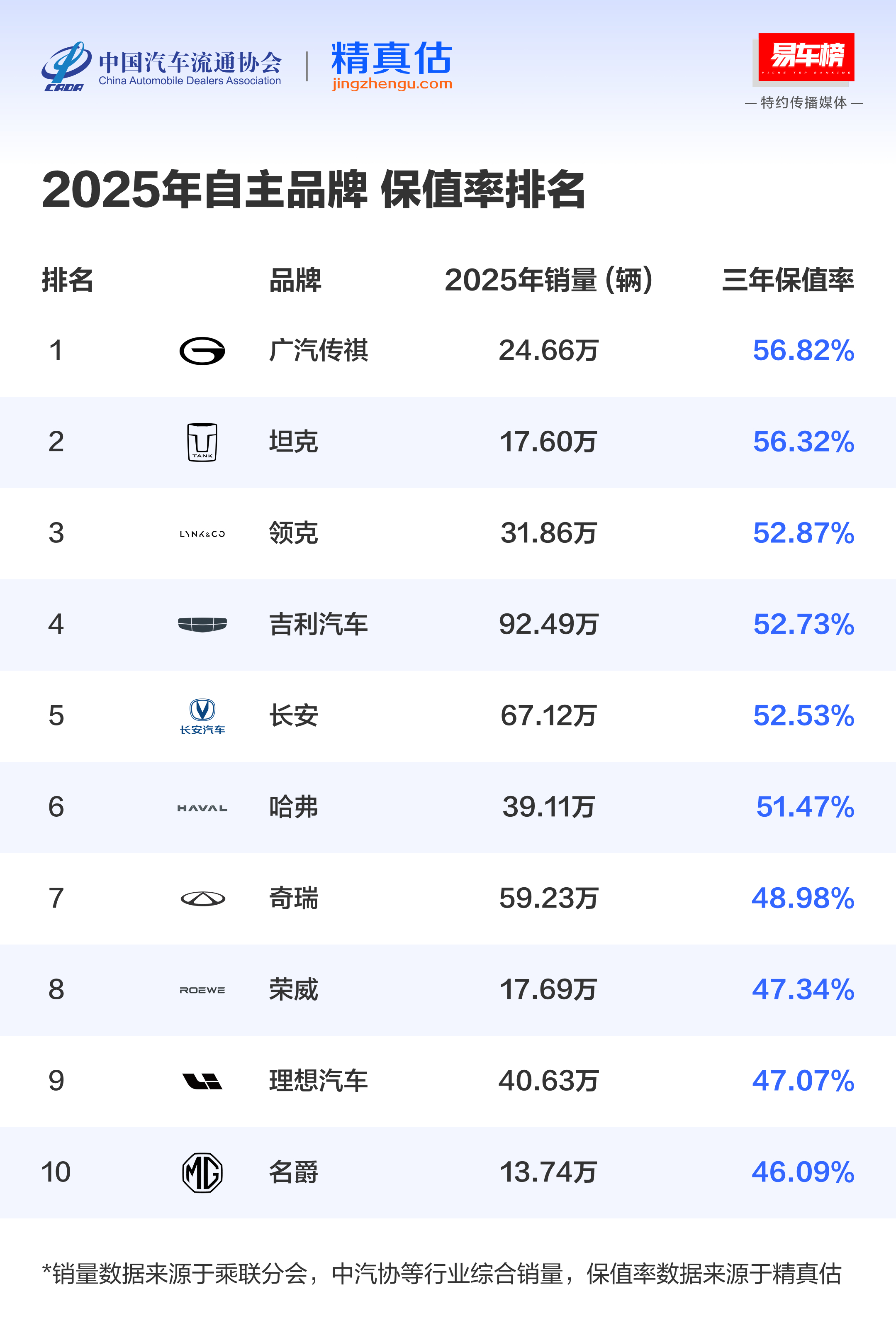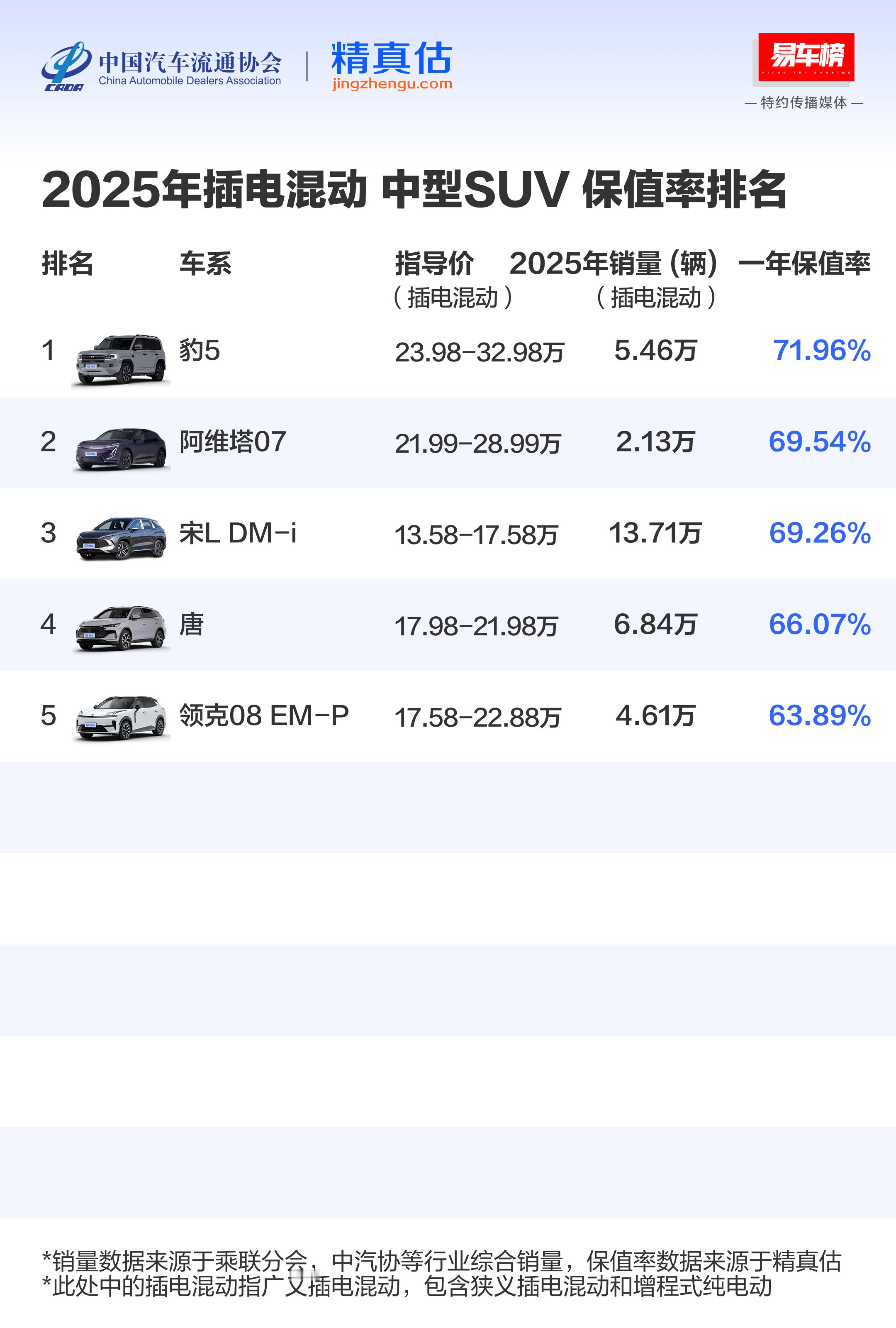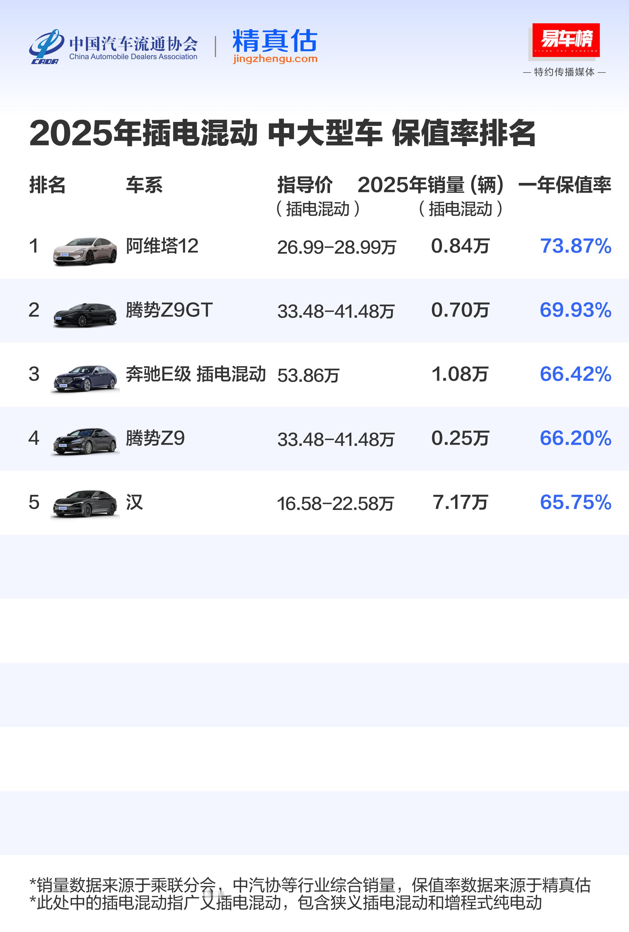 中国汽车流通协会与易车网联合发布的汽车保值率数据发布了,估计想买二手的要开心咯,特别是想买二手新能源的,只能拿一年保值率来话事啊。。。。挑几个熟悉的说:图1、图2:自主品牌保值率最高的是,三年保值率是56.82%;当然,整体看排名的话也就前六名保持到50%以上,之后均在40%这样一个区间,差别不是特别的大了图3、MPV :三年保值率中,十个产品只有最后两个是自主的,分别又是传祺 ,还有一个则是荣威,那说明传祺的MPV产品保值率相当强悍了图4、中大型插混车里,阿维塔12 排第一,比亚迪 的腾势Z9系列、汉名列其中,另外一个则是奔驰E级图5、中型插混SUV,豹5 居然排第一!那说明之前那个统一调价的动作对于后来买车的车主来说积极影响很大很大啊;第二名的是阿维塔07驭电客看车大v聊车