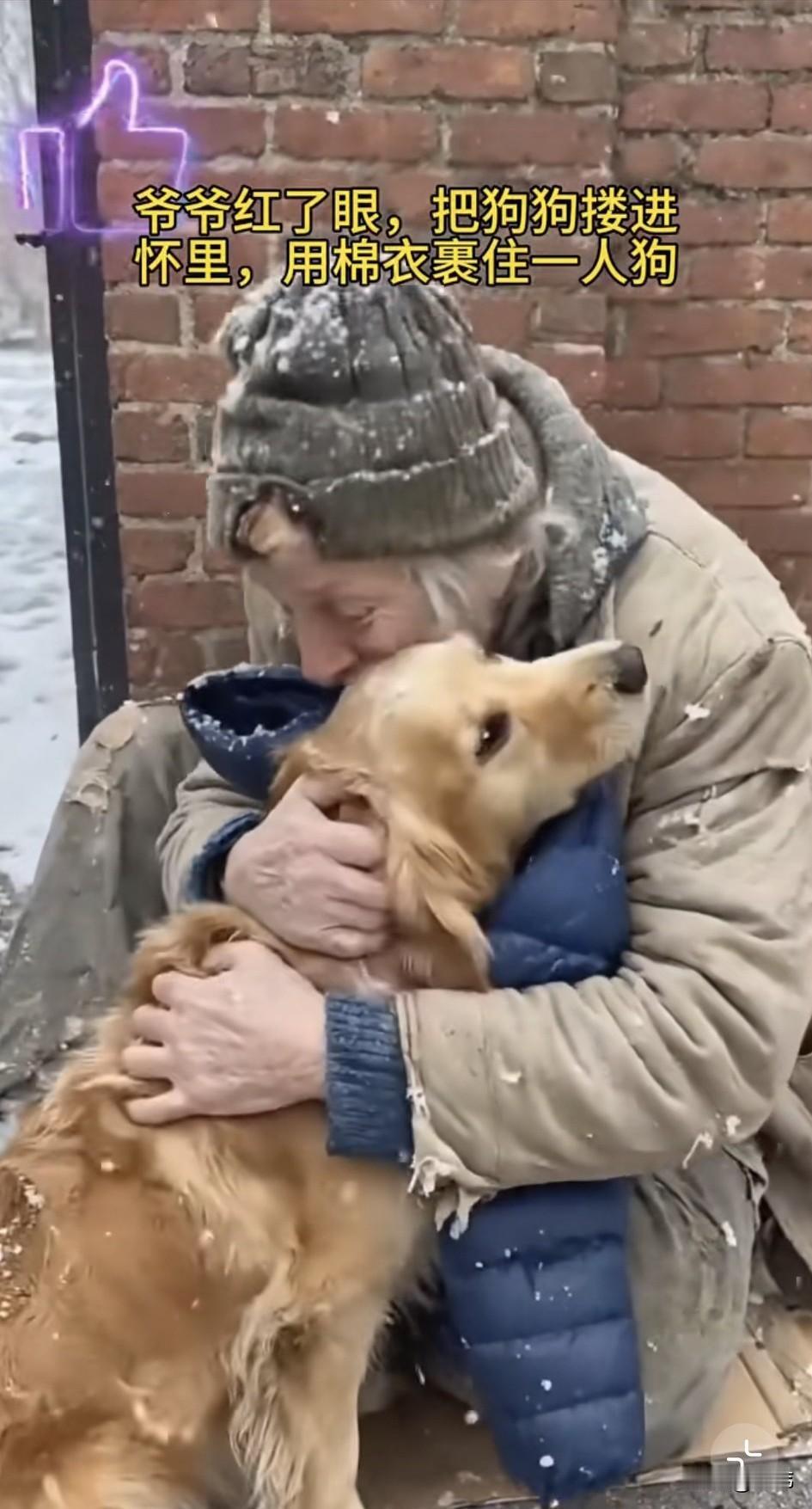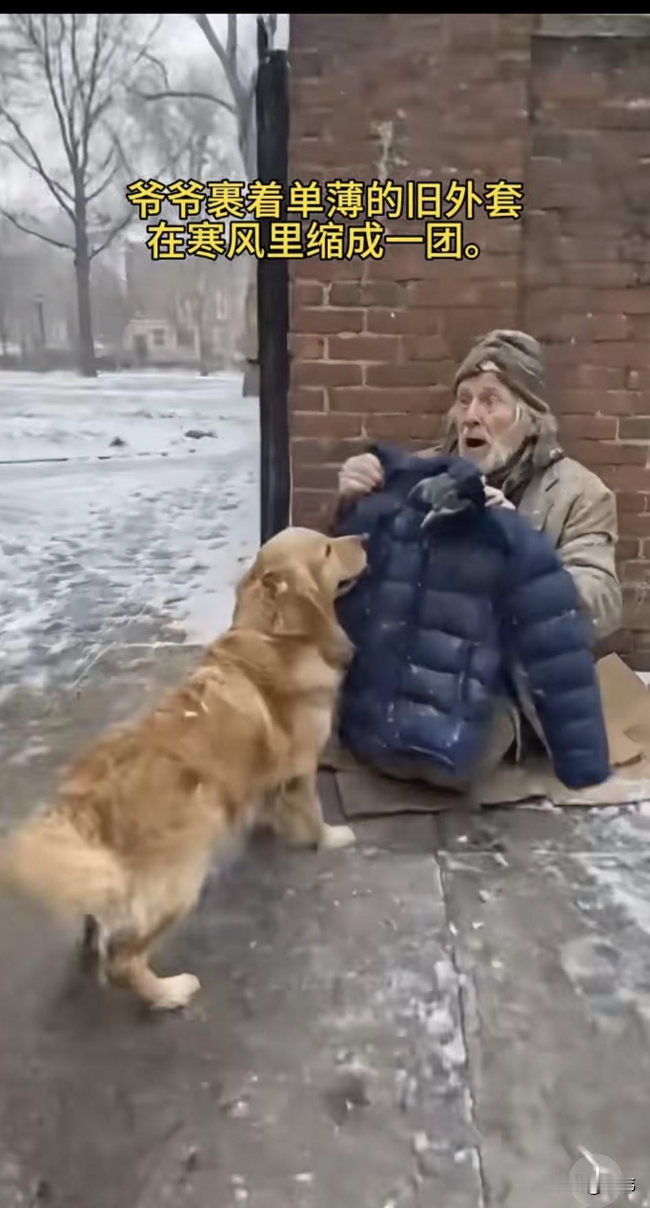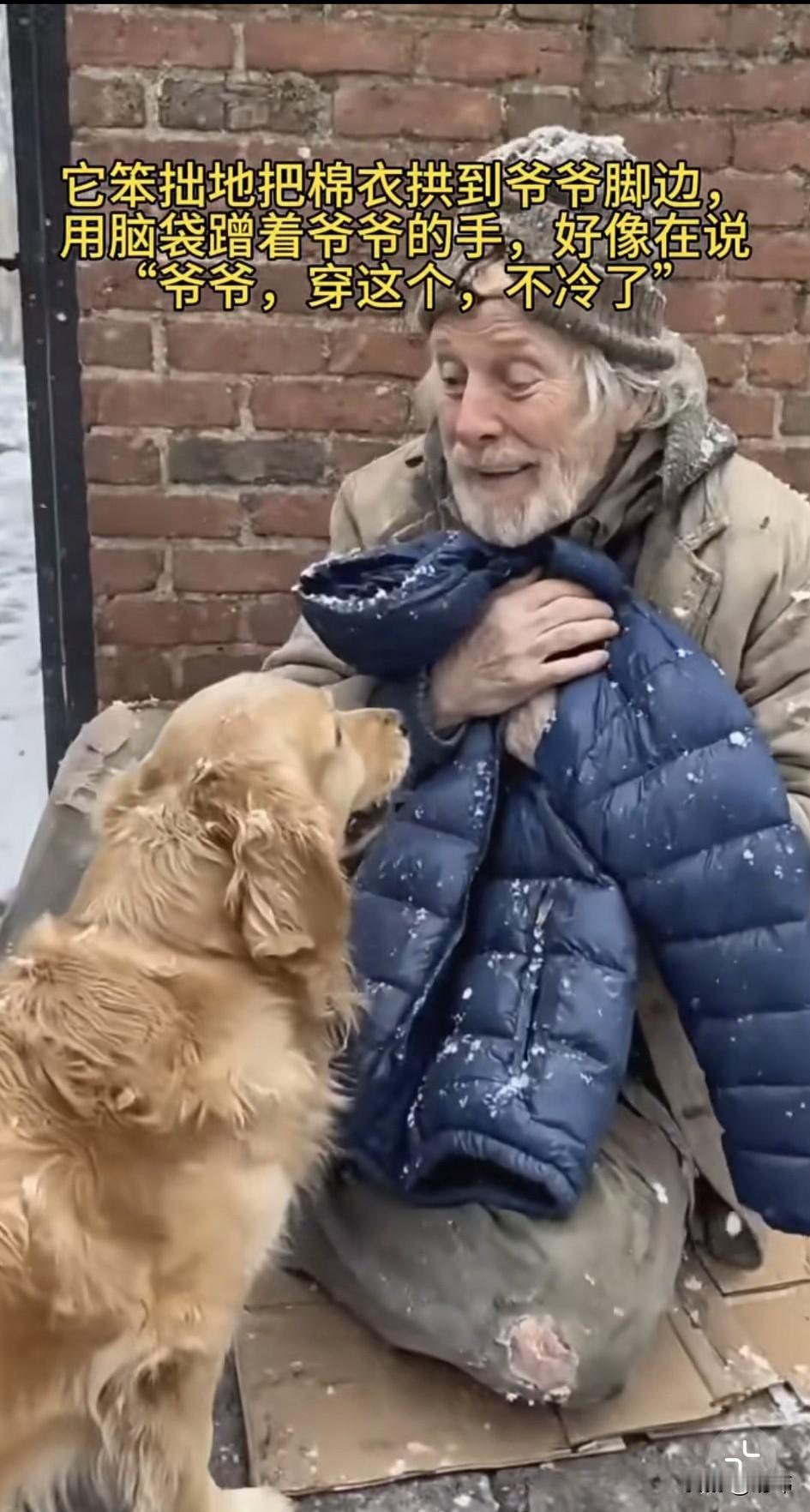 泪目了!一只流浪狗一直过着风餐露宿的生活,偶尔也会有好心人投喂它,特别是一位拾荒老人,有吃的都会分它一些。这天它蹲在墙角休息,由于下了大雪,它冻得瑟瑟发抖。 这时候一对情侣拿了一件蓝色外套丢在了旁边的垃圾桶里,狗狗看到后想到这衣服给老人穿,他不是可以御寒了吗?于是赶紧跑过去叼起衣服就朝老人那边跑去,老人正坐在另外一个街头,他裹着破旧的外套,正缩成一团的待在那里,狗狗赶紧把衣服拱到他的身边,然后用爪子指指衣服,意思是赶紧穿起来,就不会冷了,老人非常感动,他顿时红了眼,紧紧地搂住了狗狗,用棉衣裹住了他和狗狗。