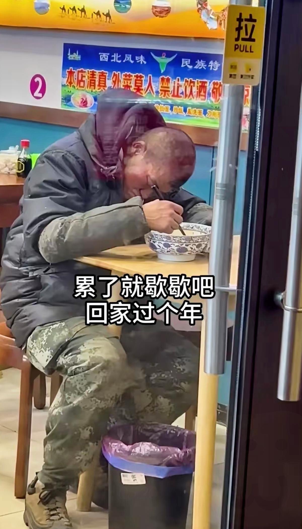 瞬间破防!街头拍到的这一幕,看哭无数打工人!大哥端着饭碗,没吃几口就歪着头睡着了,不是偷懒,是累到了身体的极限。 他是谁的父亲,谁的丈夫,谁的儿子?为了那点碎银几两,为了家里的柴米油盐,硬生生把自己熬到疲惫不堪。肩上扛的是家庭的重担,背后藏的是说不出口的辛酸。马上就要过年了,他肯定盼着早点回家,和家人吃一顿热乎的团圆饭。 我们总说成年人的世界没有容易二字,可亲眼看到这一幕,还是忍不住心疼。那些为生活奔波的人,都在咬牙硬扛,却忘了自己也需要被心疼。 你有没有在某个瞬间,突然觉得为生活打拼的自己特别不容易?评论区说说吧!打工人的现状 打工一族的现状 打工人的伤感 打工的人的日常 打工人的面貌