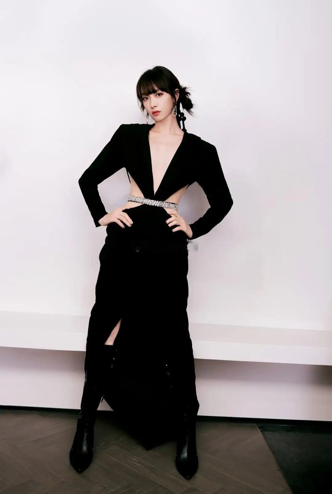 宋茜一身黑色露腰开叉裙搭配皮靴,露腰设计秀出蛮腰,开叉裙摆添性感,又飒又美,气场全开!