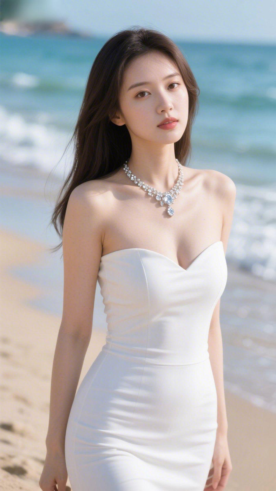 海畔素裙 细沙栖上衣角时,她立在浪与光的交界。 裙身如匀净的云缕,顺着肩线铺展成海岸线的柔弧,颈间碎钻落进风里,亮得像潮尖跃起的星子。浪声漫涌时,发梢先接住咸湿的风,裙裾轻拂脚踝,像裹住了整面海的温软。 不必刻意垂眸向镜头——抬眼时,蓝得轻颤的天、漫过脚背的浪,连同裙摆漾开的光,都成了衬景。风是软的,裙是静的,时光慢成潮声里的碎语,让人念起某段夏末的轻缓,和心底藏了许久的、关于“松弛”的想象。 海边轻氛围感 夏末闲叙