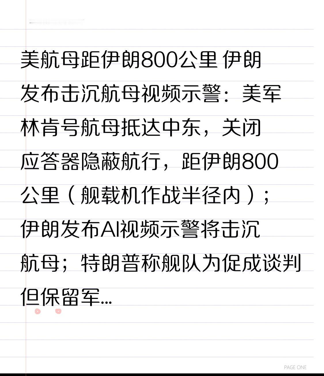 美航母距伊朗800公里 伊朗发布击沉航母视频示警:美军林肯号航母抵达中东,关闭应答器隐蔽航行,距伊朗800公里(舰载机作战半径内);伊朗发布AI视频示警将击沉航母;特朗普称舰队为促成谈判但保留军事选项,美军目标颠覆伊朗政权,美伊局势紧张。