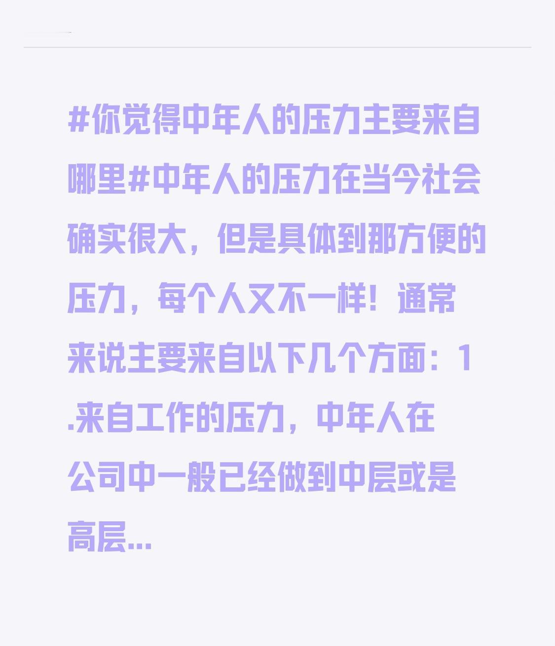 中年人的压力在当今社会确实很大,但是具体到那方便的压力,每个人又不一样!通常来说主要来自以下几个方面:1.来自工作的压力,中年人在公司中一般已经做到中层或是高层,这是最担心的就是失业。2.家庭的压力,中年人正事上有老下有小的时候,要管理孩子的学习,孩子的未来的焦虑,父母的身体等等。3.身体健康的压力,中年人身体会慢慢出现各种问题,心态年轻但是身体诚实。以上所有的压力归根到底就是经济的压力!中年 压力