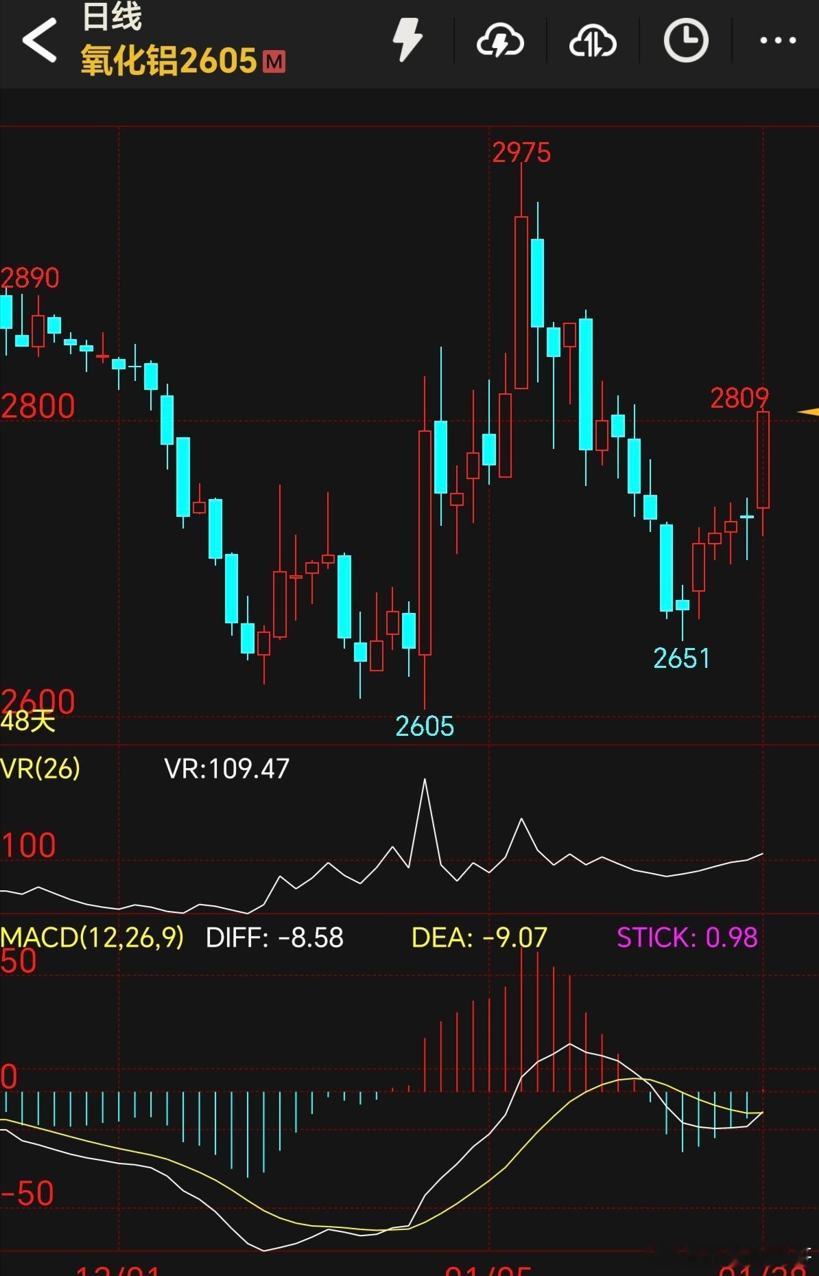 期货 氧化铝今天终于等来了大阳线!晚上再继续上的话,很可能就要转多了!如果有想做多的朋友,可以考虑氧化铝了!重点看下午收盘是否能收出来大阳线!氧化铝