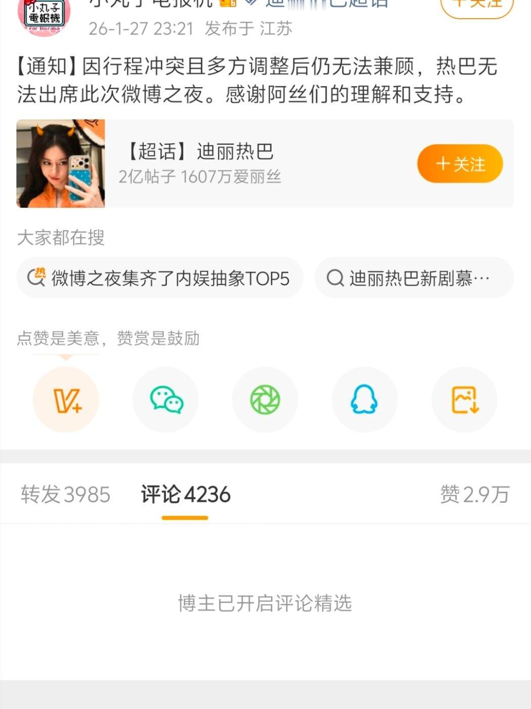 迪丽热巴不参加微博之夜,评论精选了...我想看88走红毯怎么这么难啊.....