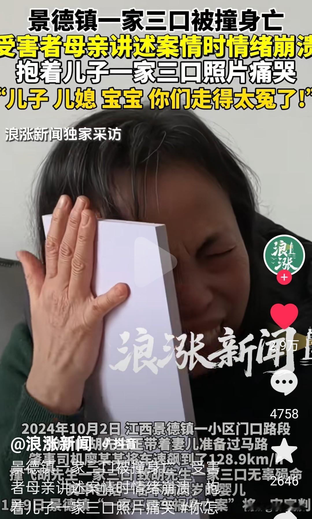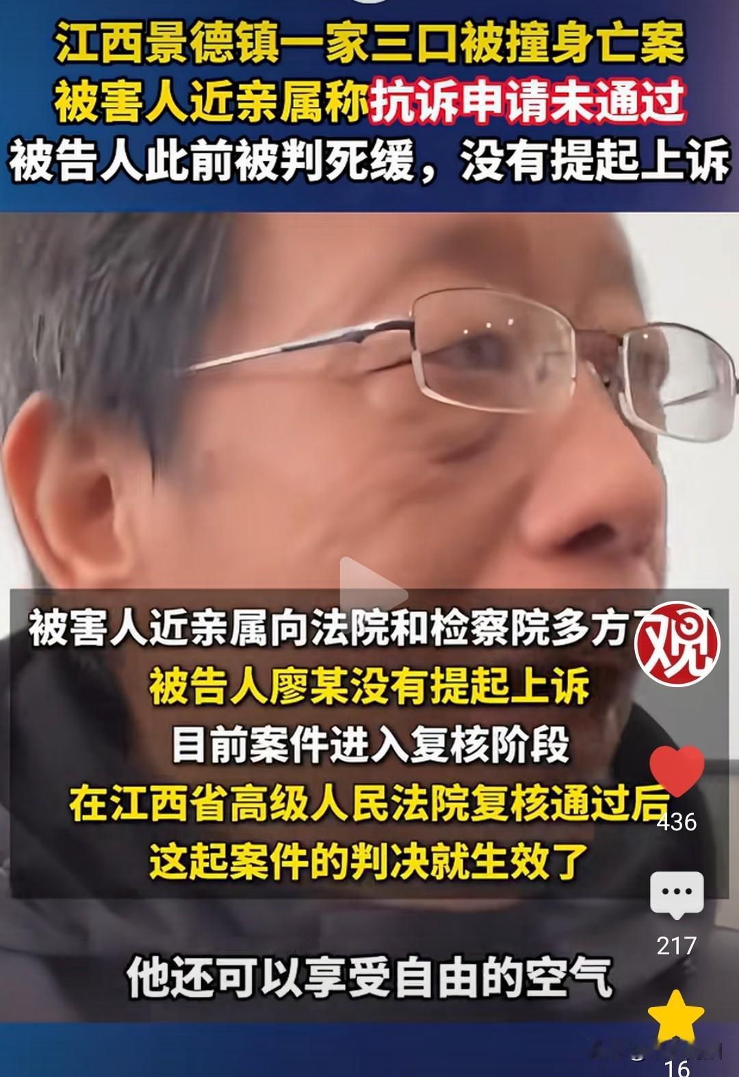 胡妈妈的抗诉申请被驳回了。1月26日,江西景德镇一家三囗被撞案!胡妈妈拿着被驳回的抗诉申请书痛哭流涕地说,我决不会放弃,一定要为儿子一家三口讨回公道,坚持向司法机关提起申诉! 被害人父亲声音颤抖地说,“我们一定要把所有的刑事案件,按照法律的程序走下去,一直走得看不见路。我们再提起民事诉讼,一直追责下去,哪怕只有0.1的希望,我们也要坚持到底。” 因廖某无视交通规则,明知在限速的主干道疯狂飙车,不顾他人的生命安全,至使胡某一家三口被撞身亡,真让人心痛! 目前,廖某没有提起上诉,案件进入复核阶段,由江西省高院复核通过后,这个案子就判决生效了。 这件事对被害人父母打击太大了,余生一直在痛苦中煎熬,老两口每天守着儿子儿媳的房子寂寞度日,幻想儿子能回来,就当他们一家三囗出了远门,总有一天会回来的。