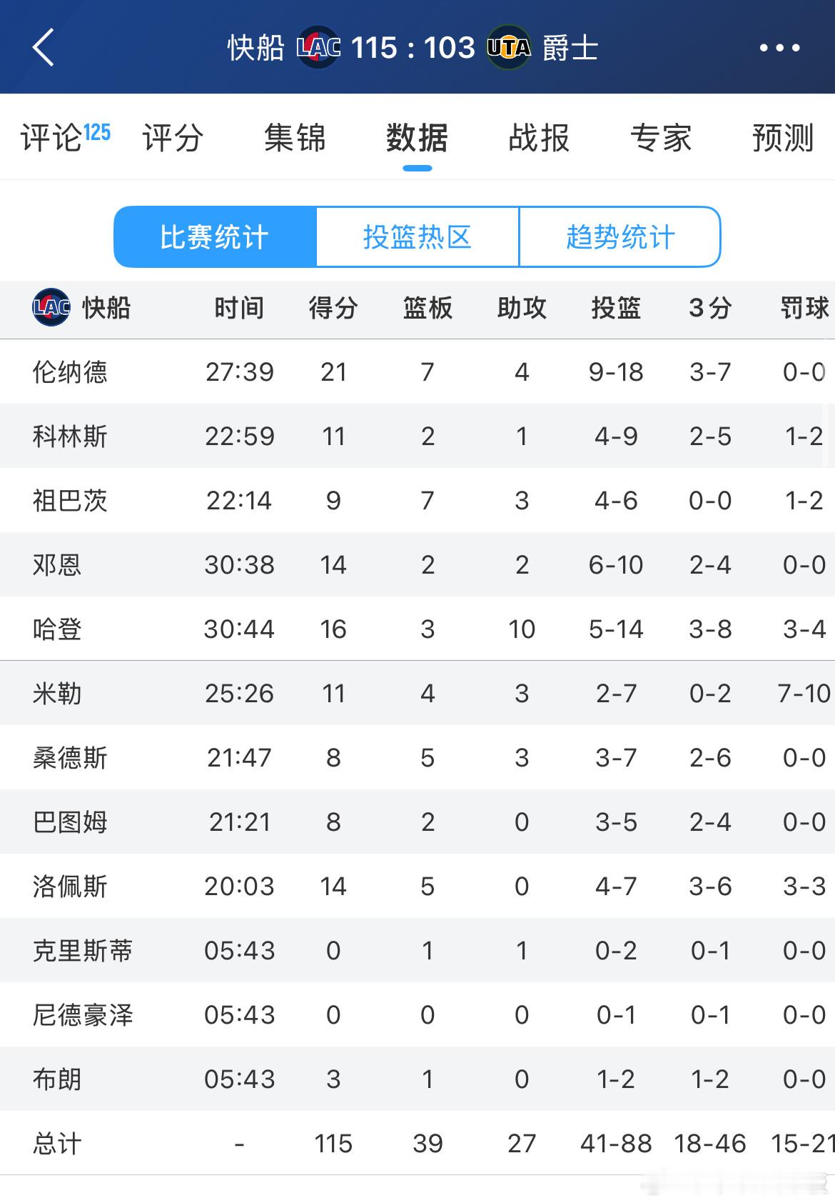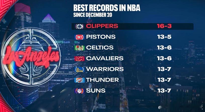 快船轻取爵士取得三连胜,胜场差已经追平第9的开拓者最近19场比赛,快船赢下其中16场快船vs爵士
