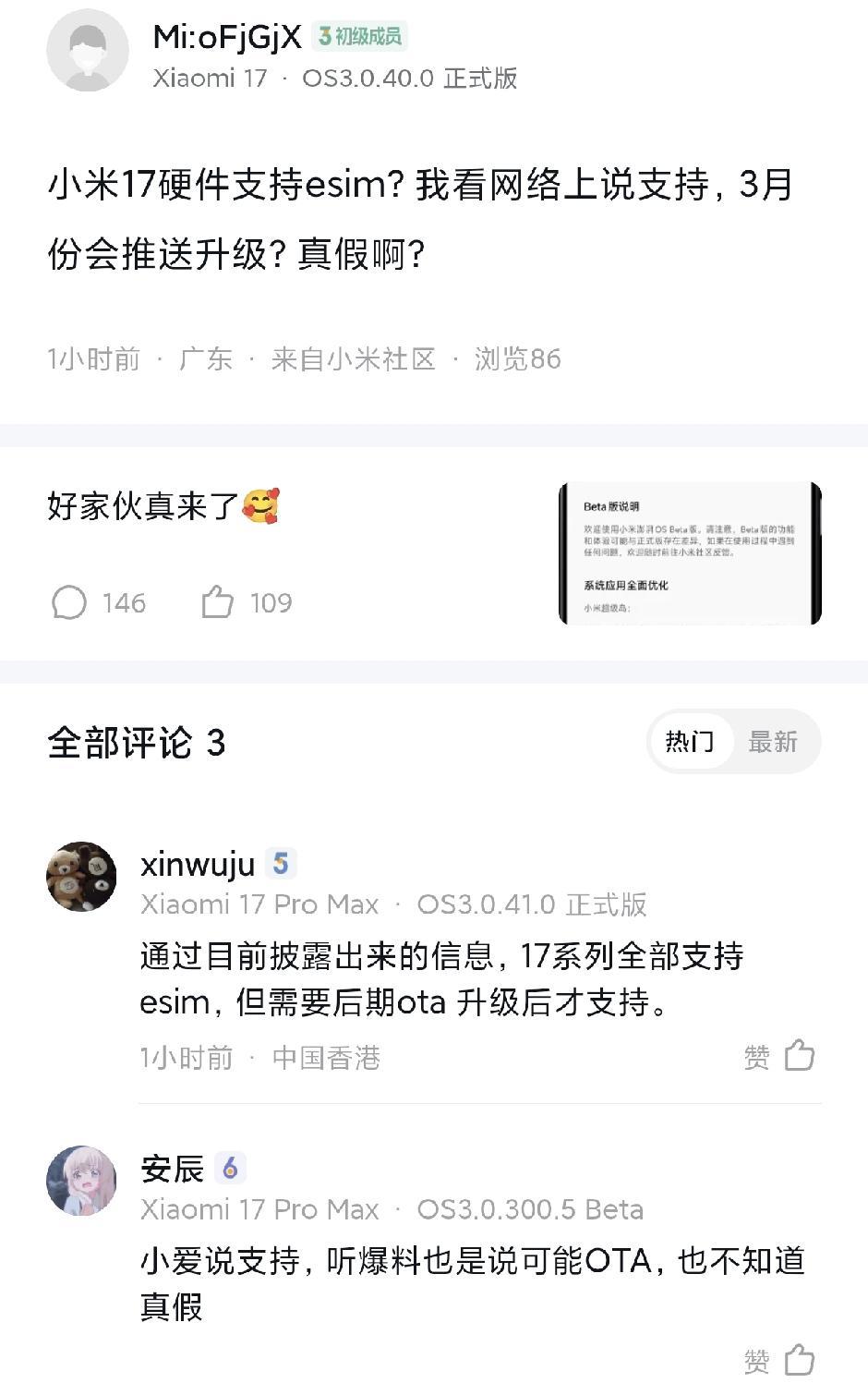 小米17是否支持esim功能? 手机要支持esim,需要在硬件增加什么器件? 要支持eSIM,手机硬件核心是eUICC芯片(嵌入式通用集成电路卡),直接焊接在主板,用于存储运营商Profile与密钥等数据,配合OTA远程配置。还需安全元件SE保障数据安全,以及OMAPI/SE接口让系统与eUICC通信,部分机型需适配LPA本地配置助手软件组件。 小米17全系列出厂时就已预装eUICC芯片等全套eSIM硬件,只是系统功能暂时未开放。