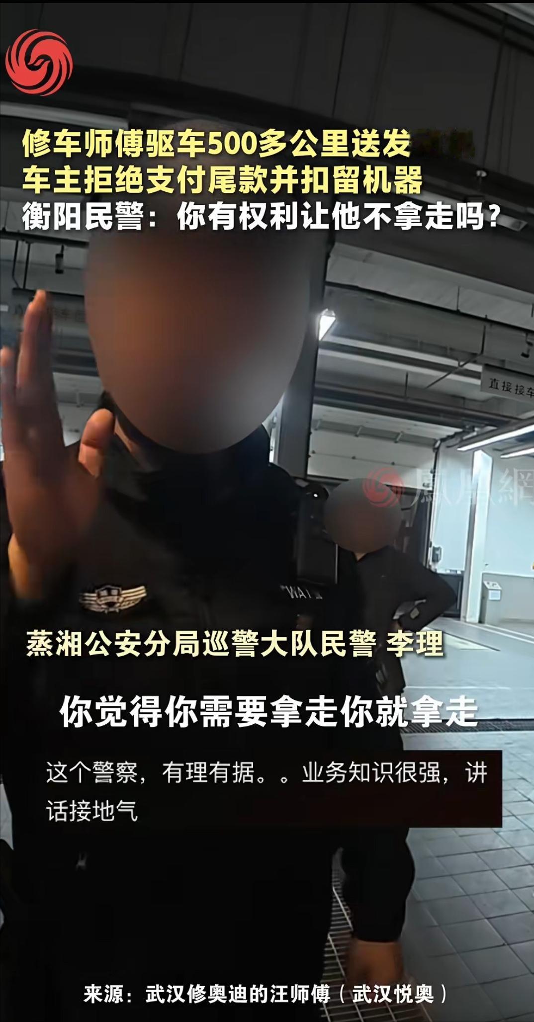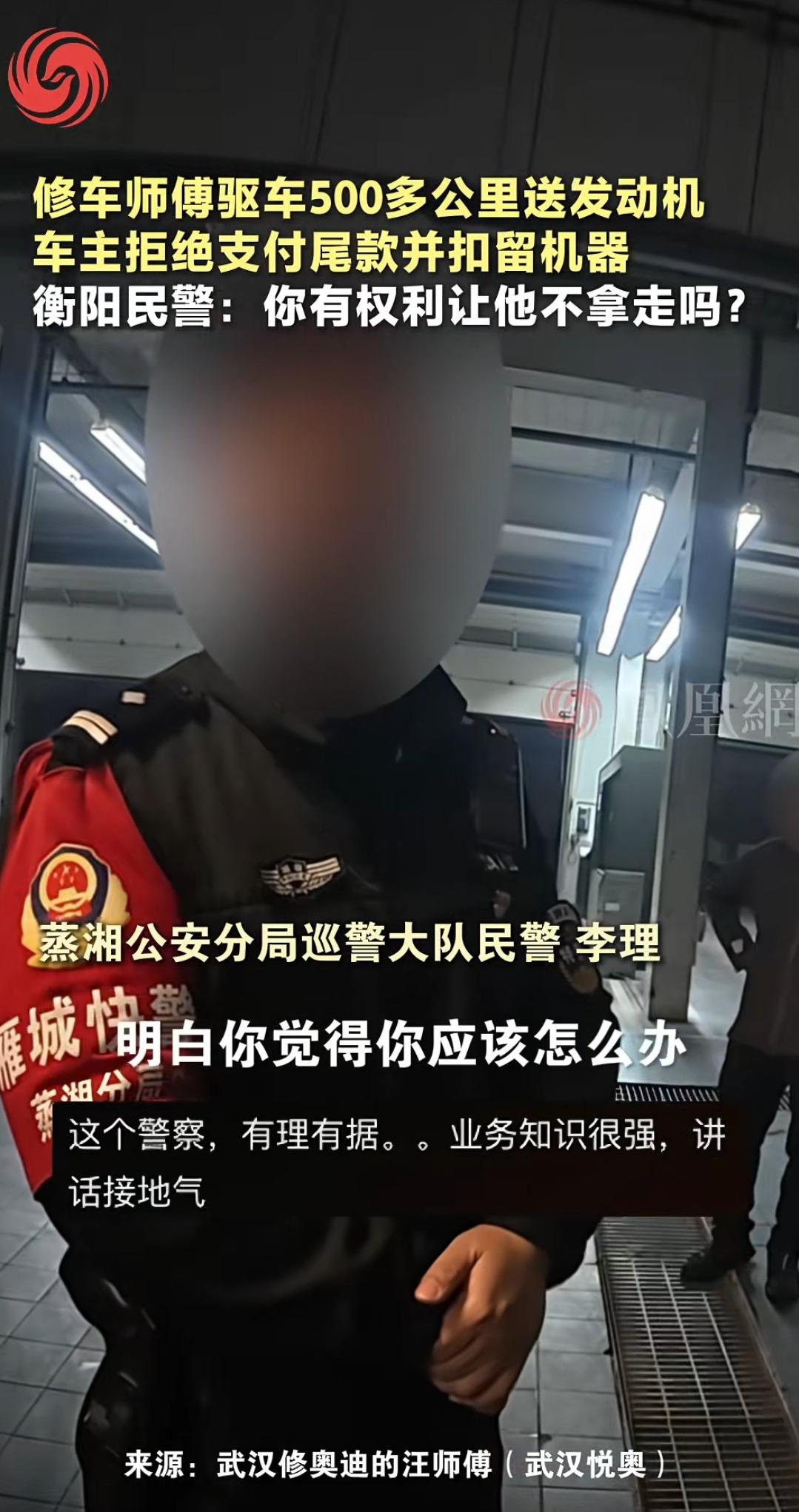 [太阳]1月26日报道,武汉汪师傅开车500多公里,去给湖南衡阳的客户送发动机。没想到到了那里后,客户翻脸不认人,不仅不支付发动机的尾款,还找来4S店的员工,要扣留汪师傅的发动机。 (信息来源:凤凰网——修车师傅驱车500多公里送发动机,车主找理由拒绝支付尾款并授意当地4S店扣留发动机,衡阳民警:你有权利让他不拿走吗?) 做生意的都懂,诚信就是立身的根,可总有人想耍小聪明钻空子,最后搬起石头砸了自己脚。武汉的汪师傅干汽修多年,一手精湛手艺加上实打实的诚信,攒下了不少回头客。 1月17日,他接到一笔三万块的订单,湖南衡阳的一位客户发动机爆缸急着换件,特意联系上他,约定好汪师傅从武汉送货到衡阳,安装试车没问题后结清尾款。 客户当场先付了一万五的定金。接下订单后,汪师傅半点不敢耽搁,火速备齐全新发动机,一个人开着车就往衡阳赶。 从武汉到衡阳全程五百多公里,往返近乎一千公里的路程,高速上的车流、沿途的夜色都透着奔波的辛苦,可汪师傅只想着尽快把货送到,别耽误客户用车,一路马不停蹄往前赶。 熬过数个小时的车程,他终于抵达了客户指定的修理厂,客户和维修师傅当场检查了发动机,确认完好无损后,却没让他动手安装,反倒把那台损坏的旧发动机递了过来,示意他先带走。 汪师傅心里掠过一丝疑惑,但也没多琢磨,转头就问起了尾款的事。没成想,刚才还客客气气的客户瞬间变了脸,找了个要先看票据的借口,说要拖延两天再付款。 汪师傅常年在外跑送货,太清楚拖延付款的猫腻,生怕后续尾款打了水漂,当即坚持要当天结清。 见汪师傅态度坚决,客户又抛出两个无理要求,要么让他把发动机拉回武汉,第二天再重新送过来,要么就在衡阳耗到周一再拿钱。 这两个要求满是不确定的风险,汪师傅想都没想就果断拒绝了。双方就这么僵持着,就在汪师傅接老板电话的空档,客户竟偷偷发动车子想溜,还好汪师傅眼疾手快,及时拦了下来。 逃跑不成,客户又装出缓和的样子,说愿意付尾款,让汪师傅报银行卡号。汪师傅低头记录卡号的瞬间,客户再次踩下油门溜之大吉。 汪师傅当即开车追赶,可他对衡阳的路况一窍不通,绕了几圈后还是让对方跑没了影。 无奈之下,他只好打算先把发动机拉回武汉,可刚准备装车,修理厂的员工却突然围了上来阻拦,说客户打过招呼,还声称和汪师傅的老板协商好了,要扣留这台发动机。 又气又急的汪师傅反复跟员工解释,尾款没结清,这台发动机的所有权就还是他的,可对方根本不听,执意不肯放行。 为了守住自己的合法权益,汪师傅当即拨通了报警电话。 民警李理接到报警后,很快就赶到了现场,仔细听完事情的来龙去脉,明确表态在尾款未结清的情况下,发动机归属汪师傅所有,修理厂没有任何权利扣押。 在民警的公正协调下,修理厂终于松了口,汪师傅顺利把发动机装上了车,启程返回武汉。 1月23日,汪师傅把这段糟心的经历拍成视频发到了网上,曝光了客户的失信行为。 没想到视频很快就火了起来,那位失信客户也因全网热议陷入了社死的境地,走到哪儿都有人指指点点。 没过多久,客户主动找上汪师傅,不仅爽快表示愿意支付尾款,还一个劲恳求他删掉视频。可此时的汪师傅,早已对这位客户的诚信彻底失望。 他把客户转来的尾款原封不动退了回去,又从之前的一万五定金里,扣除了多的油费和过路费,将剩下的退给了对方,清清楚楚表明从此不再有任何合作。 这场围绕诚信的较量,最终以汪师傅成功维护自身权益落下帷幕,民警李理的公正执法也收获了网友们的一致点赞。 其实这事说到底也简单,诚信从来不是挂在嘴边的口号,而是为人处世的底线。一个人若是丢了诚信,就算能靠投机取巧占到一时便宜,终究会失去别人的信任,到最后寸步难行。 汪师傅用自己的坚持守住了诚信的本心,也让我们看到,比起一时的利益,守住底线才能走得更稳、更远。