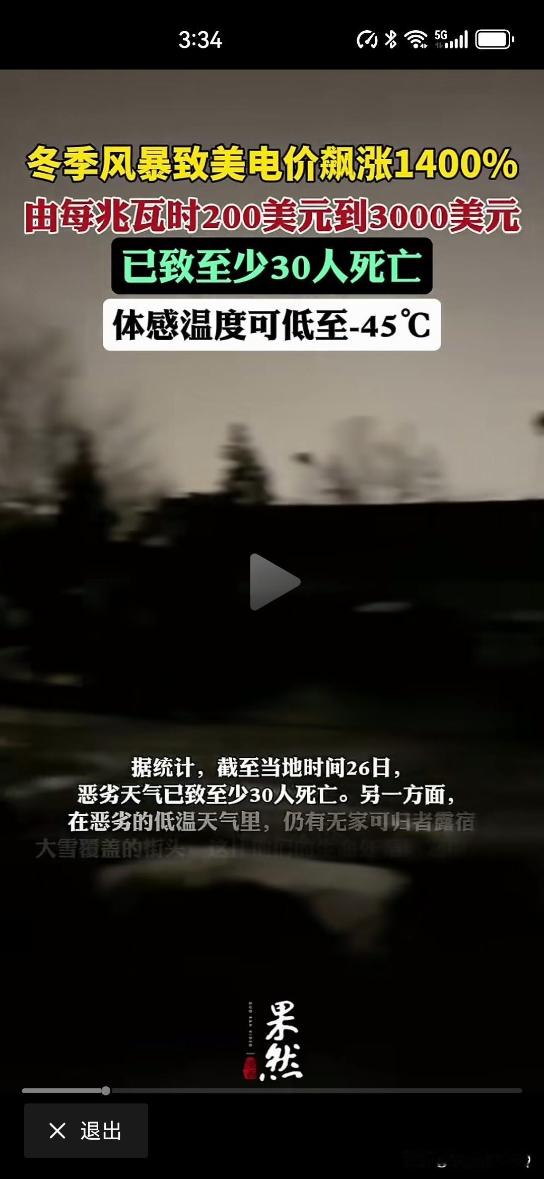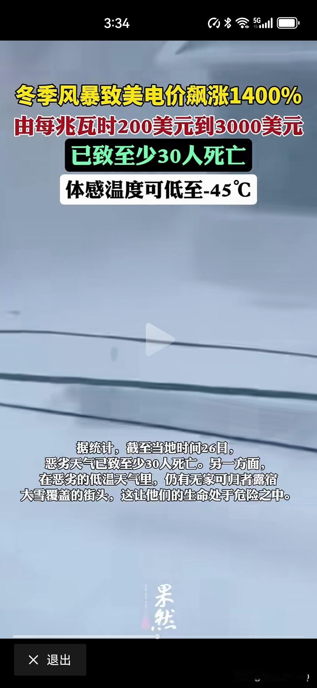 所以在美国不能大病一次。或者像这样突如其来的断电一次,过年之后基本变贫穷,或者流落街头的斩杀线! 好奇,最冷地方断电极端天气条件有哪些?而知道电车在零下45度,基本将电量消耗为零,基本跑不动!