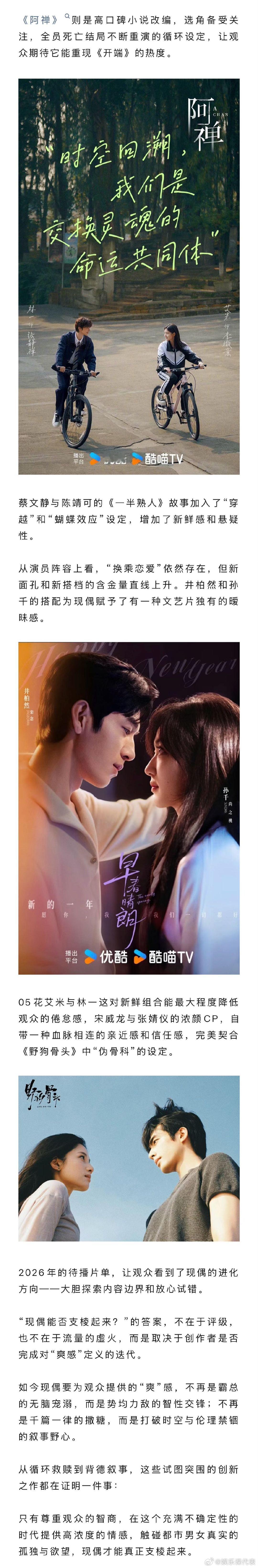 2026待播现偶神仙选角 伪骨科成2026现偶流量密码 现偶找对方向,不再是千篇一律的撒糖,而是深挖都市男女的真实欲望:《早春晴朗》《爱情有烟火》聚焦职场成年人,《新 CP 新鲜感拉满。制作性价比高 + 题材创新,现偶能否打破古偶统治?蹲下一个爆款诞生~