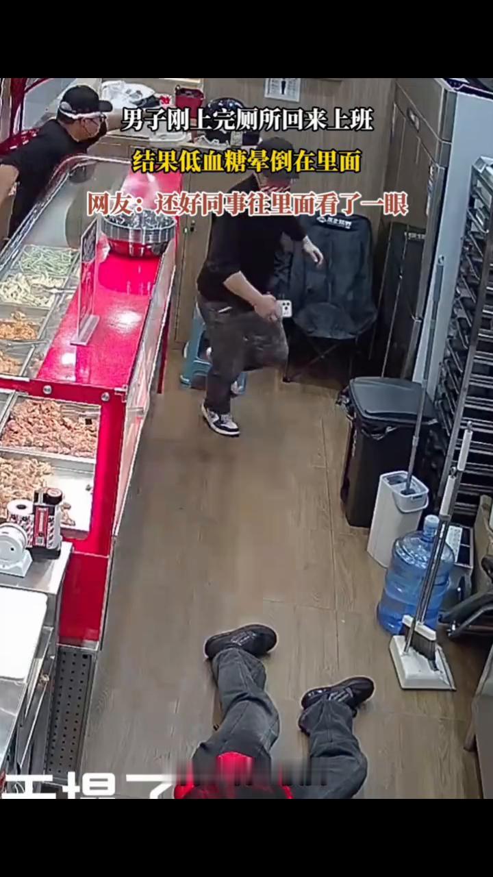 男子刚上完厕所回来上班,结果低血糖晕倒在里面。网友:还好同事往里面看了一眼。 1