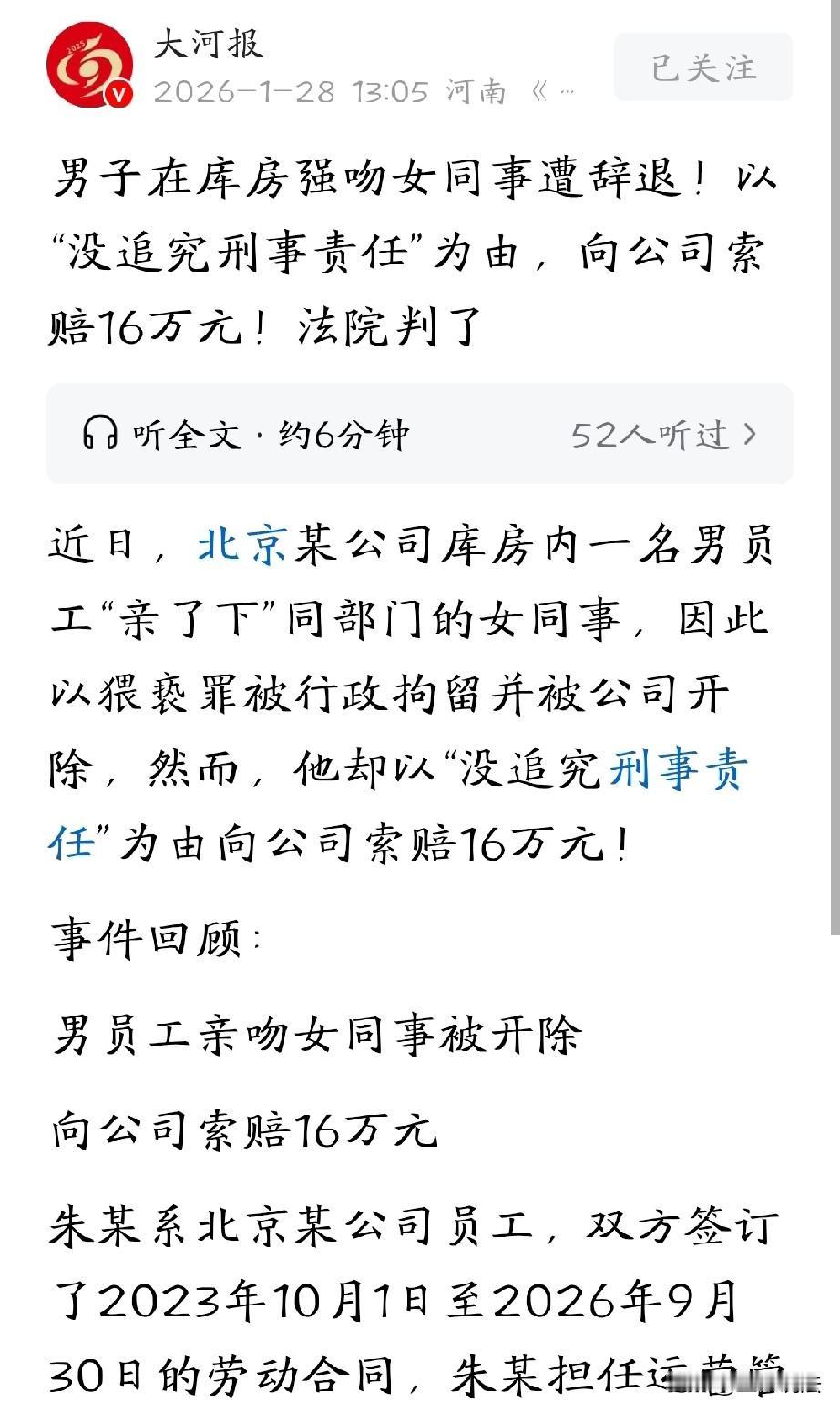 北京,男子是部门主管,看到同部门的女同事长相非常甜美,便忍不住在库房偷偷亲吻了一下女同事。女同事惊恐不已,报警求助,男子被公安机关认定猥亵,还对其行政拘留5天。事发后,公司开除了男子,男子却不服气,反而把公司告上法庭,索要16万余元的赔偿。男子:我只是行政拘留,又不是刑事犯罪,公司凭什么开除?经过两审,法院最终这样判! 男子朱某算得上事业有成,年纪轻轻就成为公司的部门主管,担任着公司的运营管理岗位。 手头有了权力,朱某也渐渐的有点飘了,心思也放到了一些工作以外的事情上。 2025年2月,朱某看到同部门的女同事王某长相甜美,心里突然就起了歪念头。 趁着王某去库房取东西的间隙,朱某趁着王某没防备,偷偷凑上去亲了王某一下。 本以为他是主管,这么亲一下王某也没什么大问题,万万没想到,王某吓得当场尖叫不说,还直接拨打了报警电话。 朱某心里其实也有点慌,知道自己这事儿做得不地道,可又觉得不就是亲一下嘛,也没造成啥严重后果。 不成想,警方调查后,直接认定朱某的行为构成猥亵,对他处以行政拘留5天的处罚。 从看守所出来后,公司也派人找朱某谈话。 朱某心里明白,这事儿瞒不住了,只能老老实实承认他在某库房内亲了下女员工王某的事实。 公司有了这份朱某自己承认的“认罪书”,很快就给他寄去了一份《解除劳动合同通知函》,理由是朱某自认存在违规事实,并表示愿意接受公司处理。 经公司研究决定,根据公司《员工日常管理奖惩办法》的相关规定,自2025年5月15日起公司与朱某正式解除了劳动合同。 朱某收到通知函后,他彻底傻眼了。他不就是亲了一下女员工嘛,不至于丢掉饭碗吧。 更何况,朱某认为他只是被行政拘留了,又不是被追究刑事责任,公司凭什么开除他呀? 越想越气,朱某一纸诉状把公司告到了法院,要求公司支付违法解除劳动合同赔偿金168446.52元,还有工作期间的加班费10560.91元,以及未休年休假工资12673.09元等等。 法院认为,从现有证据来看,朱某确实因为违法行为被公安机关行政拘留了。 公司依照《员工日常管理奖惩办法》还有相应法律规定,解除和朱某的劳动合同,完全属于合法解除。 因此,一审法院就没支持朱某要求支付违法解除赔偿金的诉讼请求,判决驳回了。 朱某不甘心,又提起上诉。 他始终觉得,按照法律规定,劳动者只有被追究刑事责任的时候,用人单位才可以解除劳动合同。 而“被追究刑事责任”的范围里,根本不包括刑事拘留、行政拘留。 就算公司已经把这个劳动纪律在规章制度里写了,或者劳动合同里约定了,那也是违反劳动合同法的,应该被认定无效。 公司依据这些解除和他的劳动合同,就是违法解除。 二审法院审理认为,劳动者被追究刑事责任,用人单位可以解除劳动合同,这说明劳动者被追究刑事责任是用人单位解除劳动合同的充分条件,但不是必要条件。 公司在规章制度里规定,员工受到公安部门行政处罚的,公司可以解除劳动合同还不支付补偿,这个规定合情合理,也不违反法律规定,而且经过了民主程序,具备法律效力。 因此,法院认定公司解除朱某的劳动合同,不属于违法解除。 最终二审判决驳回朱某关于违法解除劳动合同赔偿金的上诉请求,维持原判。 朱某身为部门主管,手握管理职权却无视职场边界与他人权益,趁隙强吻女同事的行为,既触碰法律红线构成猥亵,又失尽管理者的职业操守与基本素养。 被行政拘留已是法律的惩戒,公司依规开除更是合情合理的职场处置。 可他非但毫无悔意,反而以“非刑事处罚”为由状告公司索要赔偿,尽显自私与偏执。 朱某无视自身过错、妄图用法律钻空子为不当行为开脱的做法,这般毫无底线的行径,不仅丢了工作,更失了做人的体面与职场的立身之本。