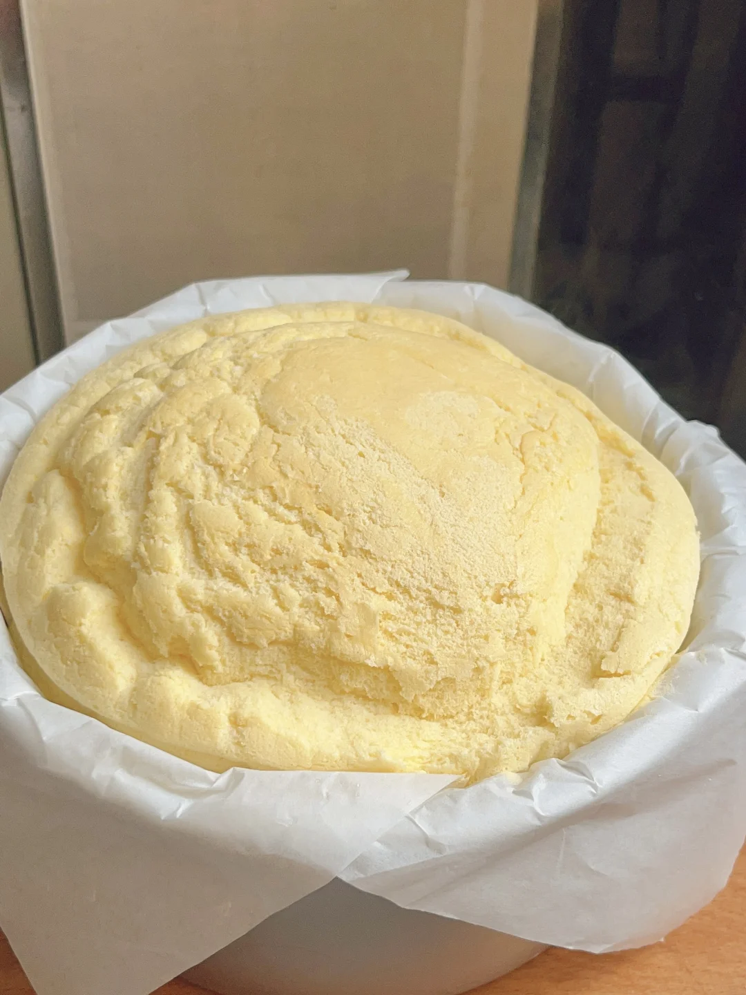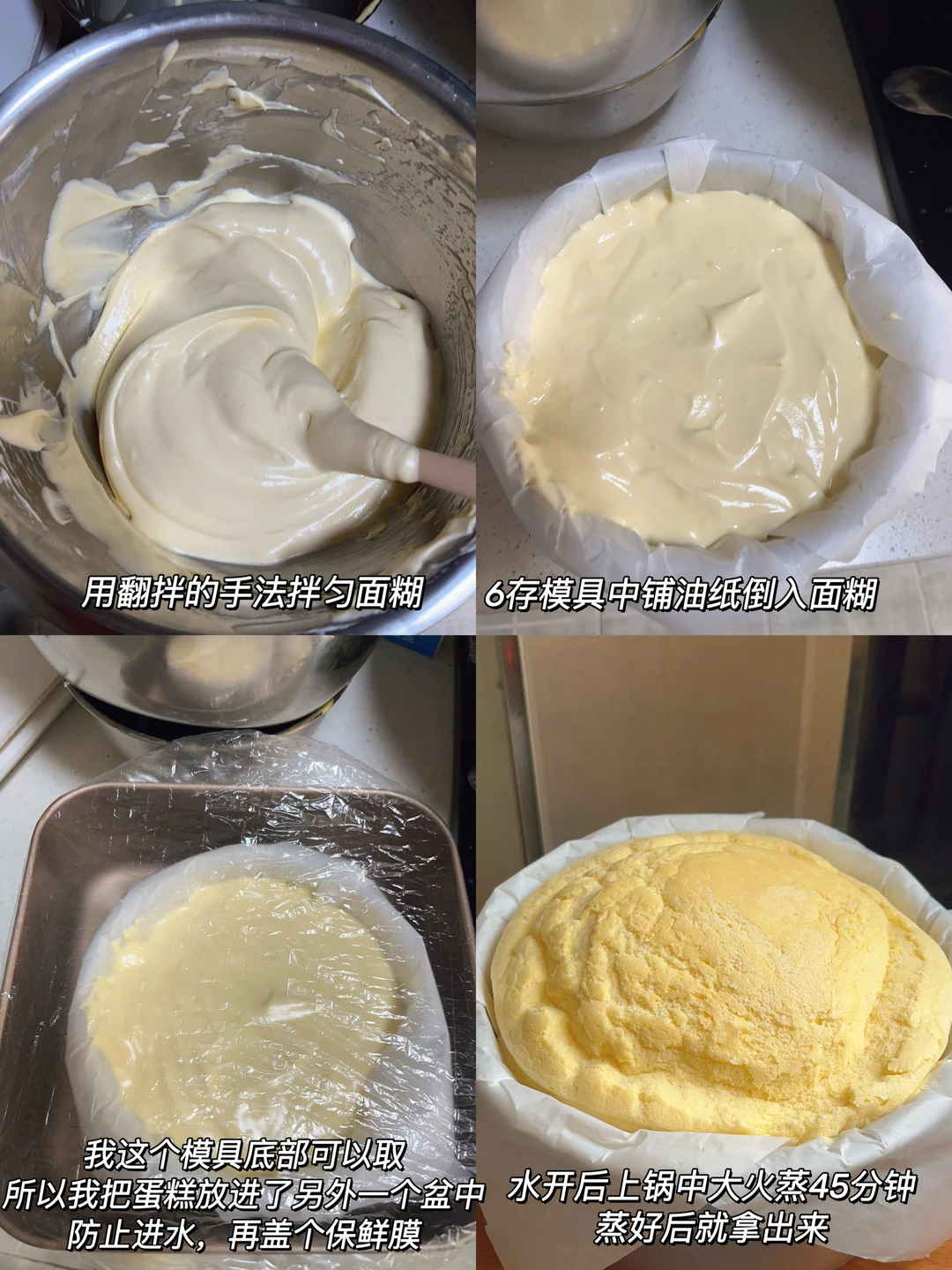 4⃣️6存模具铺油纸倒入面糊,没得模具就用盆大碗都可以,我这个模具是活底的所以外面我又用大一点的盆装防止进水,如果就是用盆和碗装的面糊这可以省掉,外面再盖个保鲜膜,水开后上锅中大火蒸45分钟,蒸好就开盖拿出来